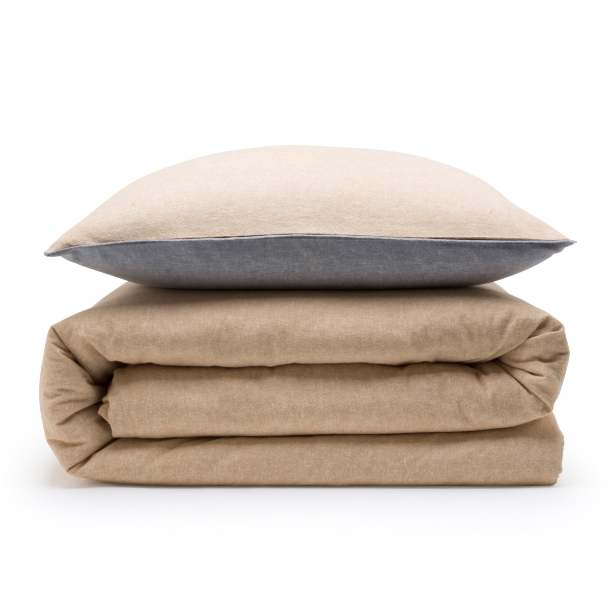 Parure de lit en flanelle coton réversible unie 57 fils beige / gris clair comprenant 1 housse de couette + 2 taies d'oreiller 63x63cm.