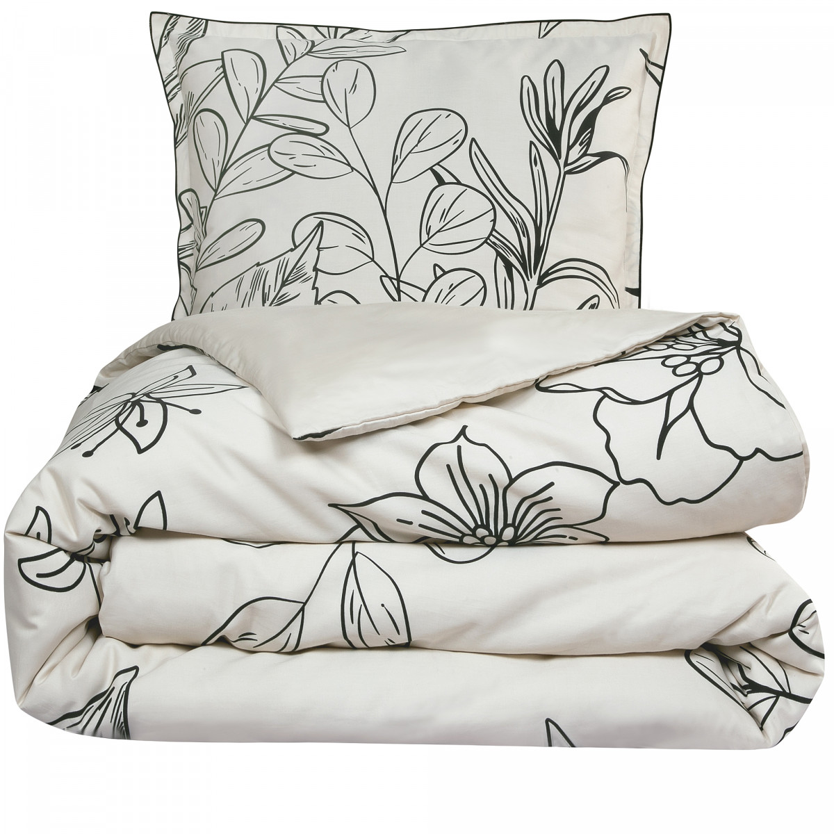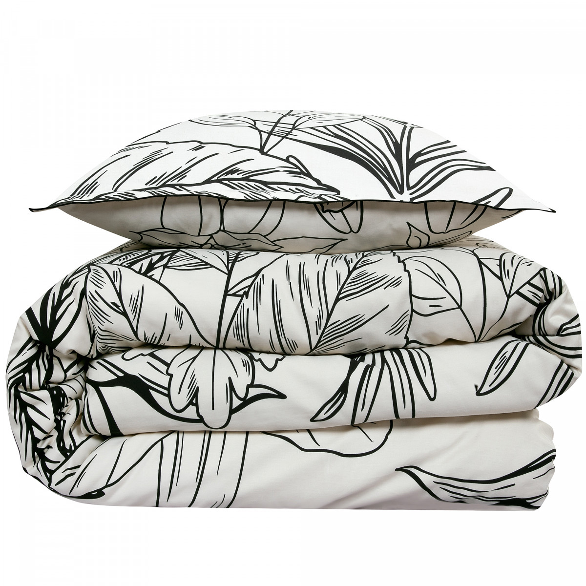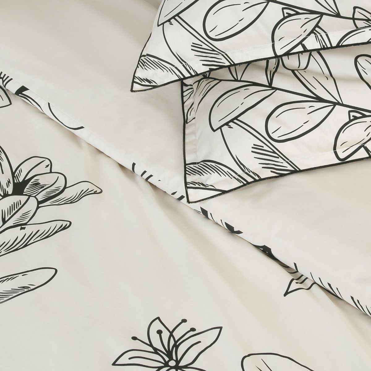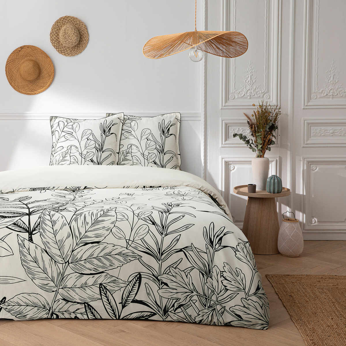 Son imprimé végétal noir sur un fond beige doux apporte une note à la fois naturelle et sophistiquée, s'intégrant harmonieusement à tous les styles de décoration. Confectionnée en satin de coton 120 fils d'une qualité exceptionnelle, elle offre un toucher soyeux et enveloppant, idéal pour des nuits paisibles et réparatrices.
