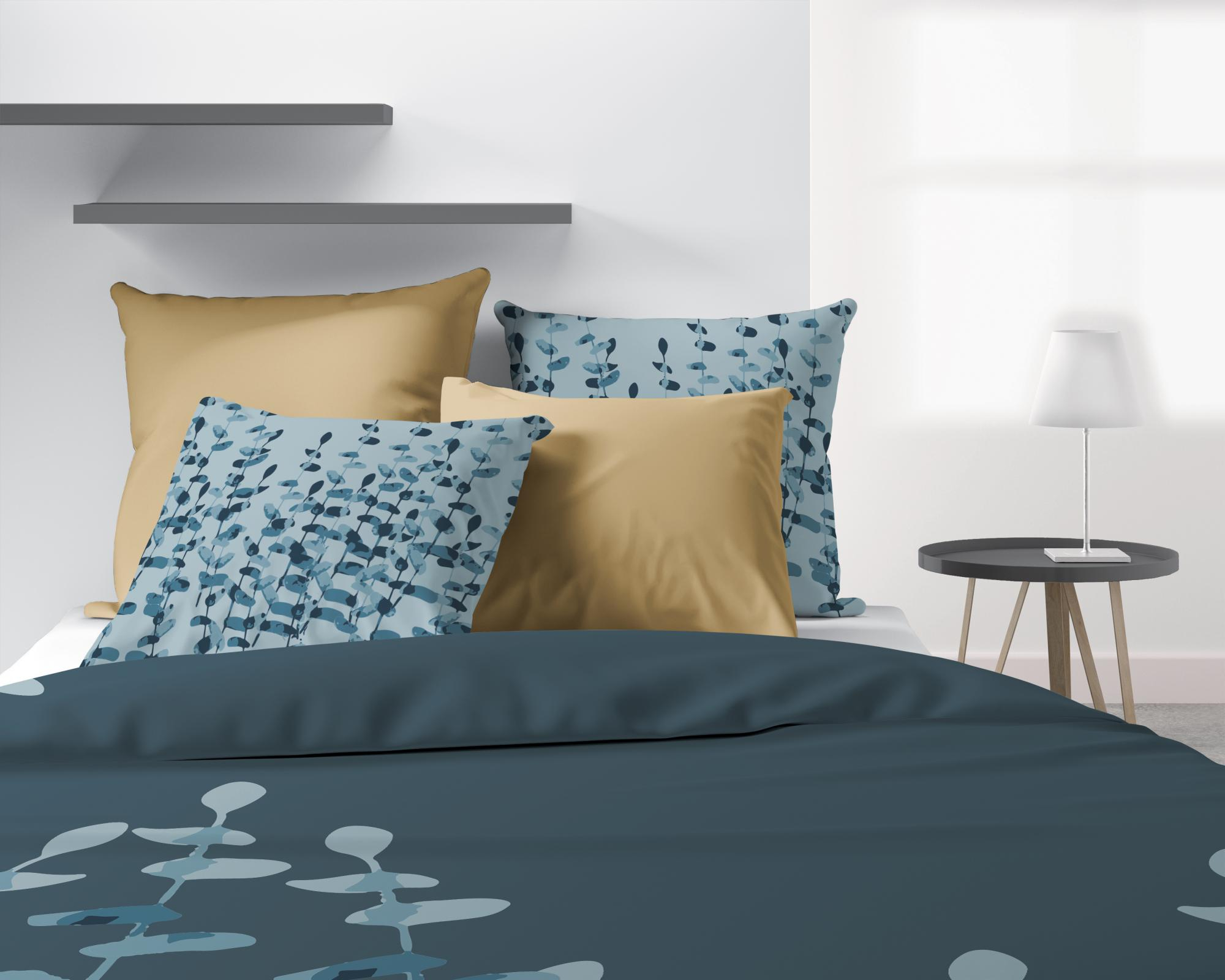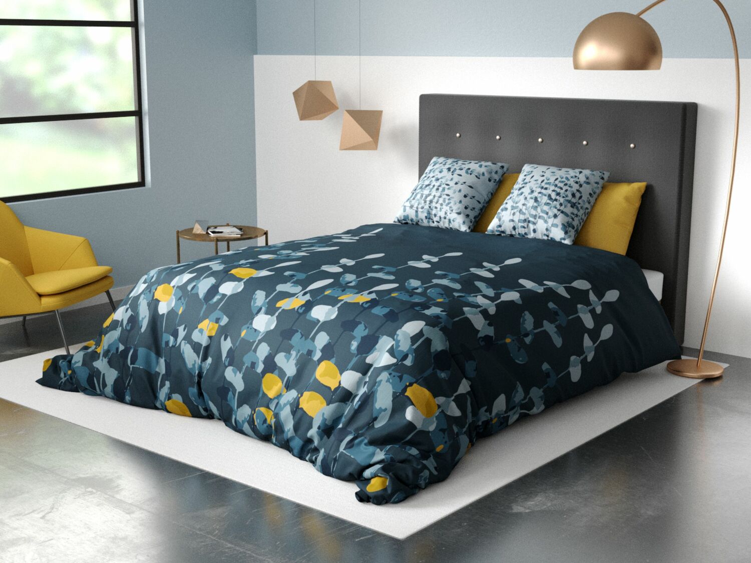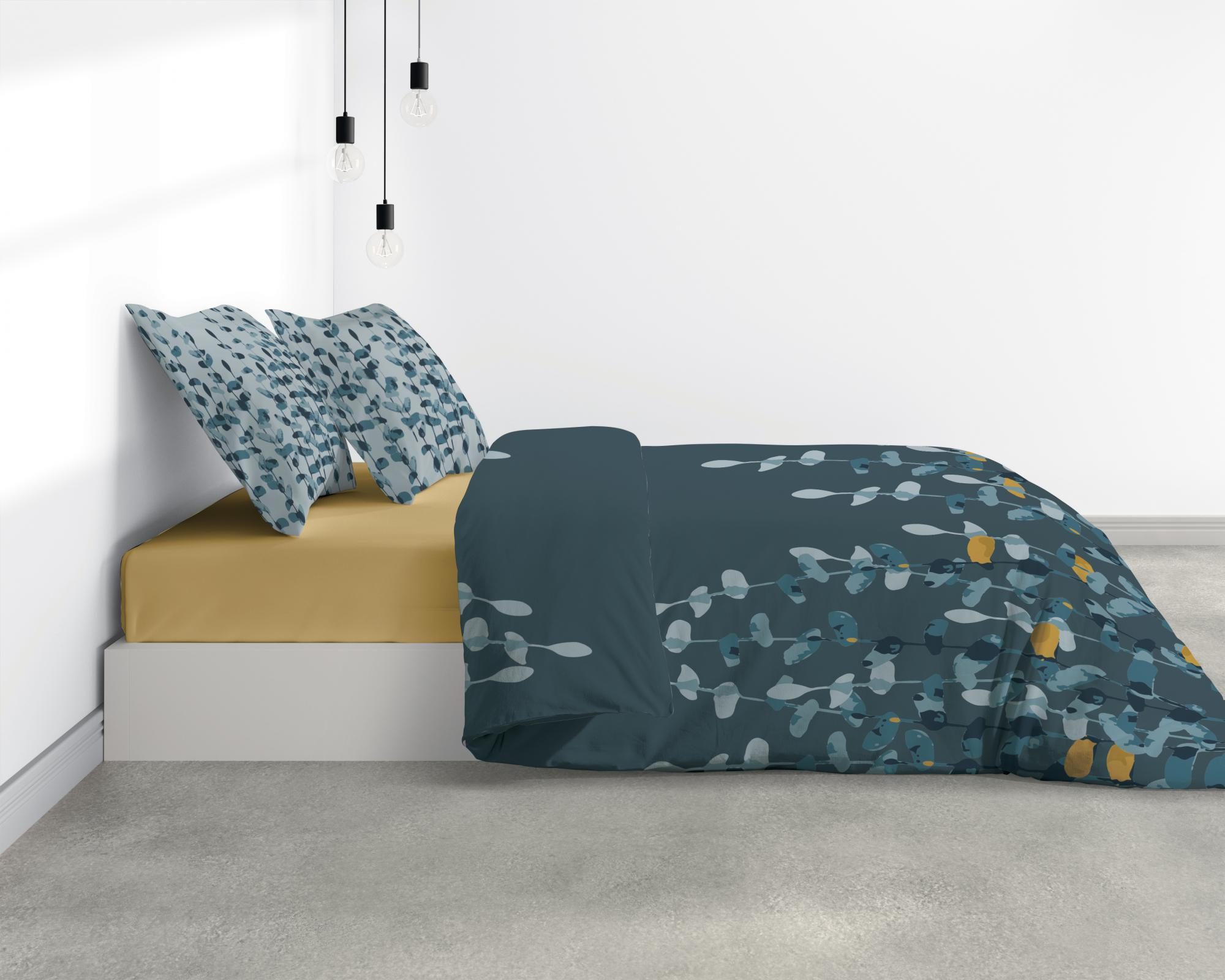Faites confiance à la parure Lunaria pour prendre soin de vos nuits. Composée à 100% de coton biologique et certifiée Oeko-Tex, elle convient aux personnes les plus sensibles, qui pourront enfin dormir sur leurs deux oreilles. L'ensemble comprenant 1 housse de couette et 2 taies d'oreiller, s'installe sans effort grâce à la fermeture à boutons pression de la housse et en rabats pour les taies. Le jeu de teintes bleutées crée une ambiance apaisante, ponctuée de touches d'un jaune lumineux. Engagés en faveur de la protection de l'environnement et convaincus qu'une démarche éco responsable profite à tous, nos stylistes chez Decotextile ont conçu tout une ligne en coton bio. Découvrez-la et faites-vous, vraiment, plaisir !