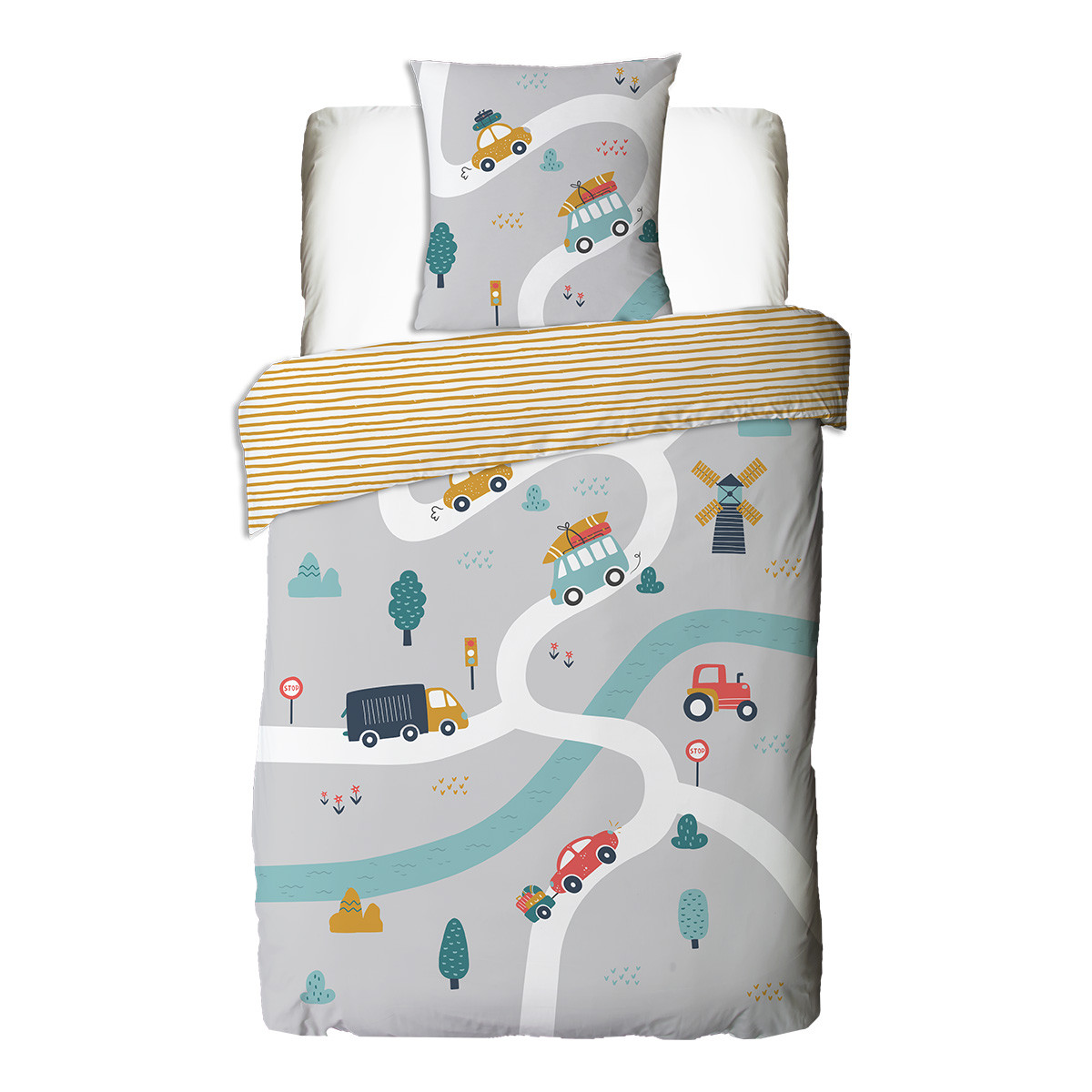 Parure de lit enfant en coton réversible imprimé voiture 57 fils gris comprenant 1 housse de couette 140x200cm + 1 taie d'oreiller 63x63cm.