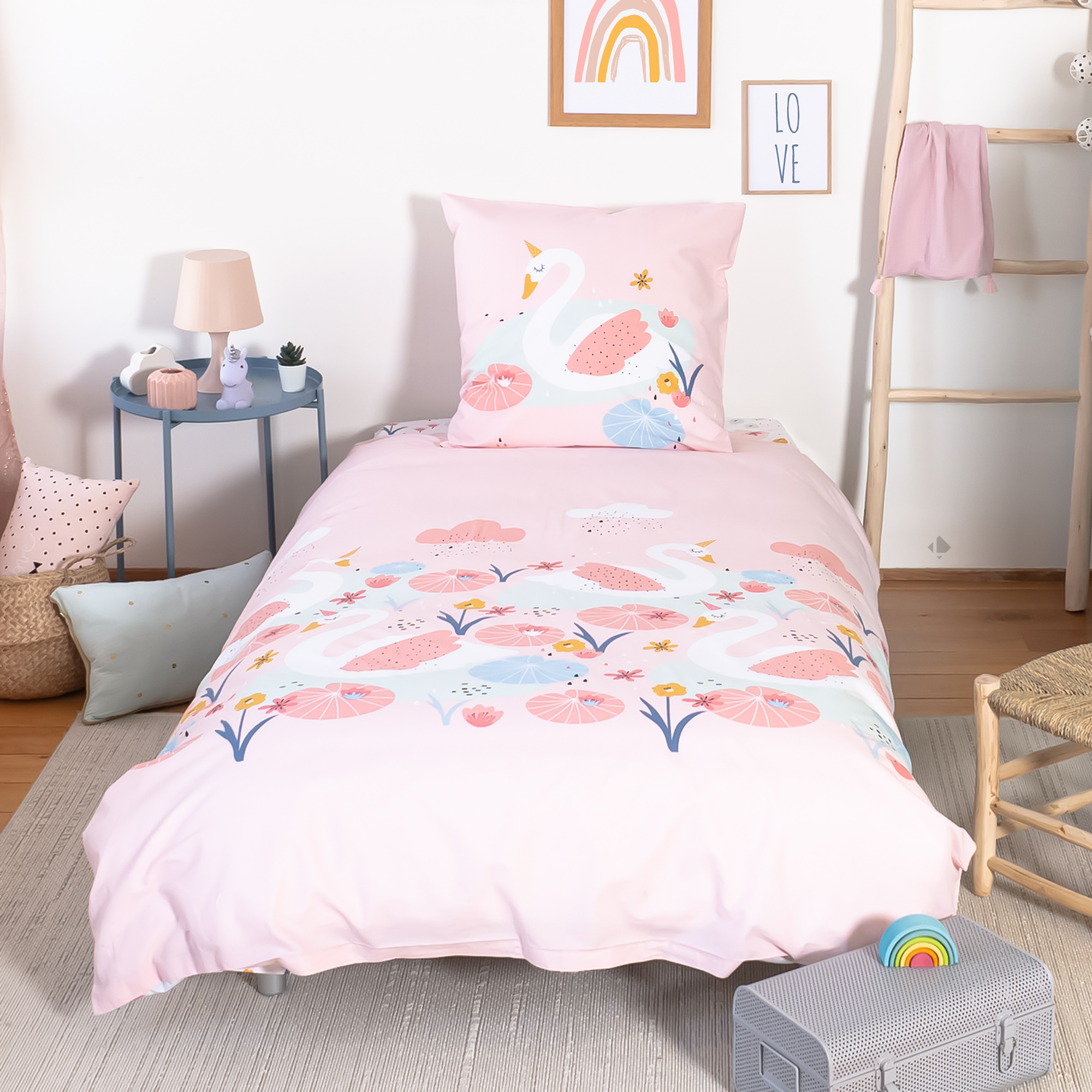 Ambiance girly avec cette parure de lit imprimée de cygnes, nénuphars et fleurs dans des tons pastels de bleu, rose et orange sur fond rose poudré. La collection linge de lit CLARA ROSE POUDRÉ en coton est idéale pour une décoration de chambre d'enfants avec des couleurs très douces.