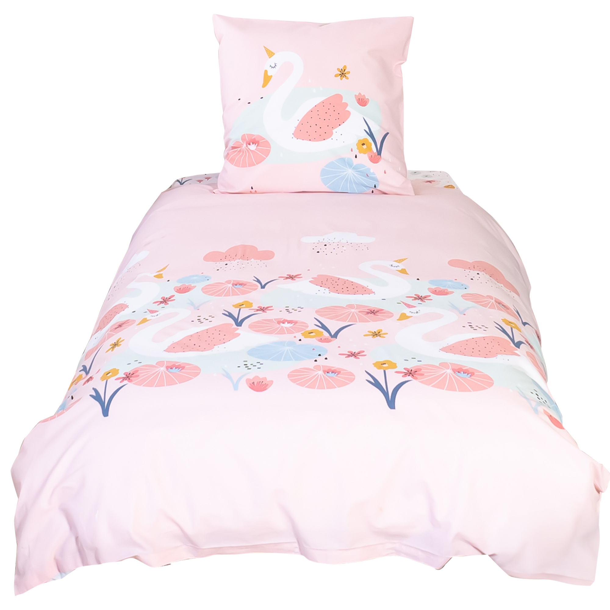 Housse de couette reversible avec une face imprimée de cygnes, nénuphars et fleurs dans des tons pastels de bleu, rose et orange sur fond rose poudré, sur l'autre face allover de fleurs et nénuphars sur fond blanc. Finition simple sans rabat aux pieds, fermeture par boutons, et passe-mains pour enfiler la couette facilement.