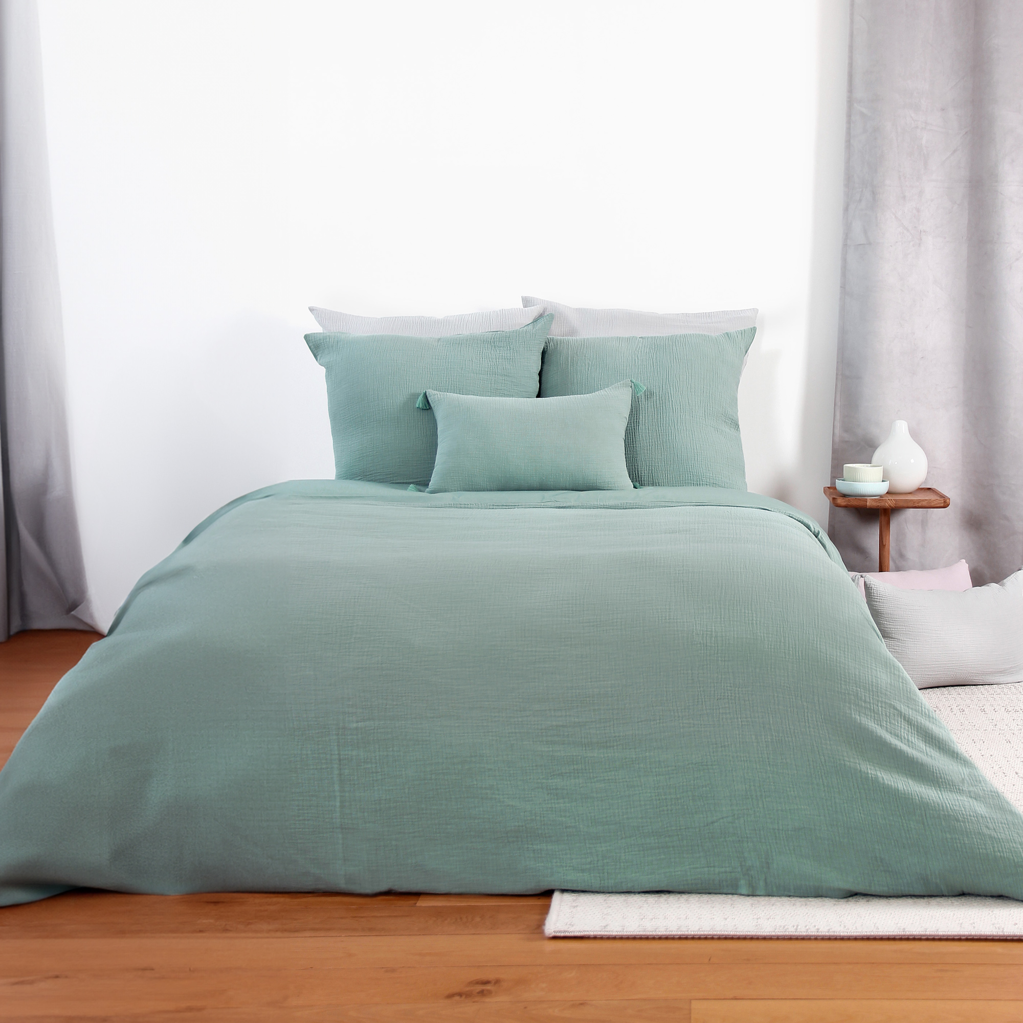 Parure de lit 260x240 cm double gaze de coton GAZGAZ vert amande 3 pièces