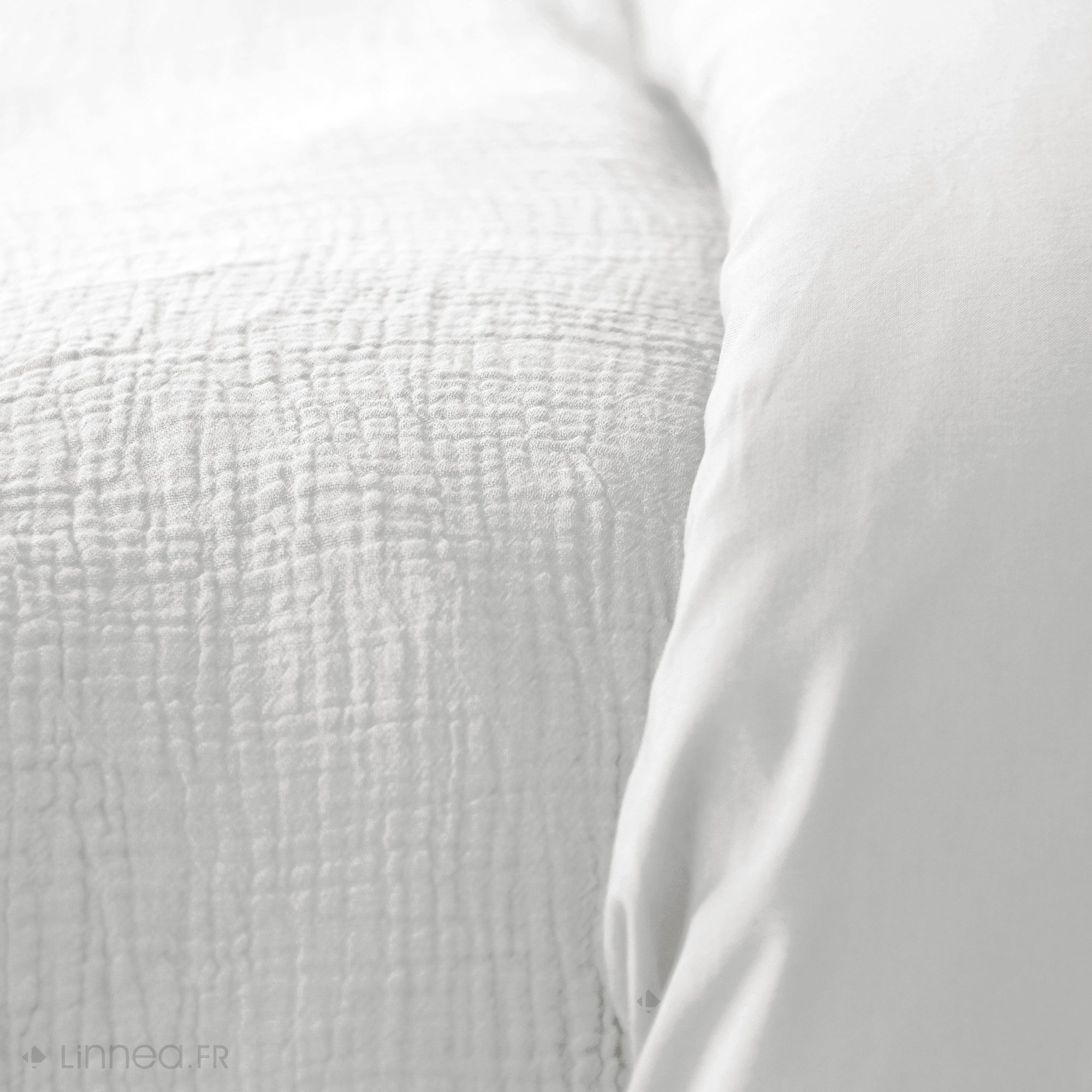 | Plus produit | Parure de lit 260x240cm GAZGAZ blanc avec une face double gaze de coton 140g/cm2 et une face 100% coton 57 fils/cm2 |