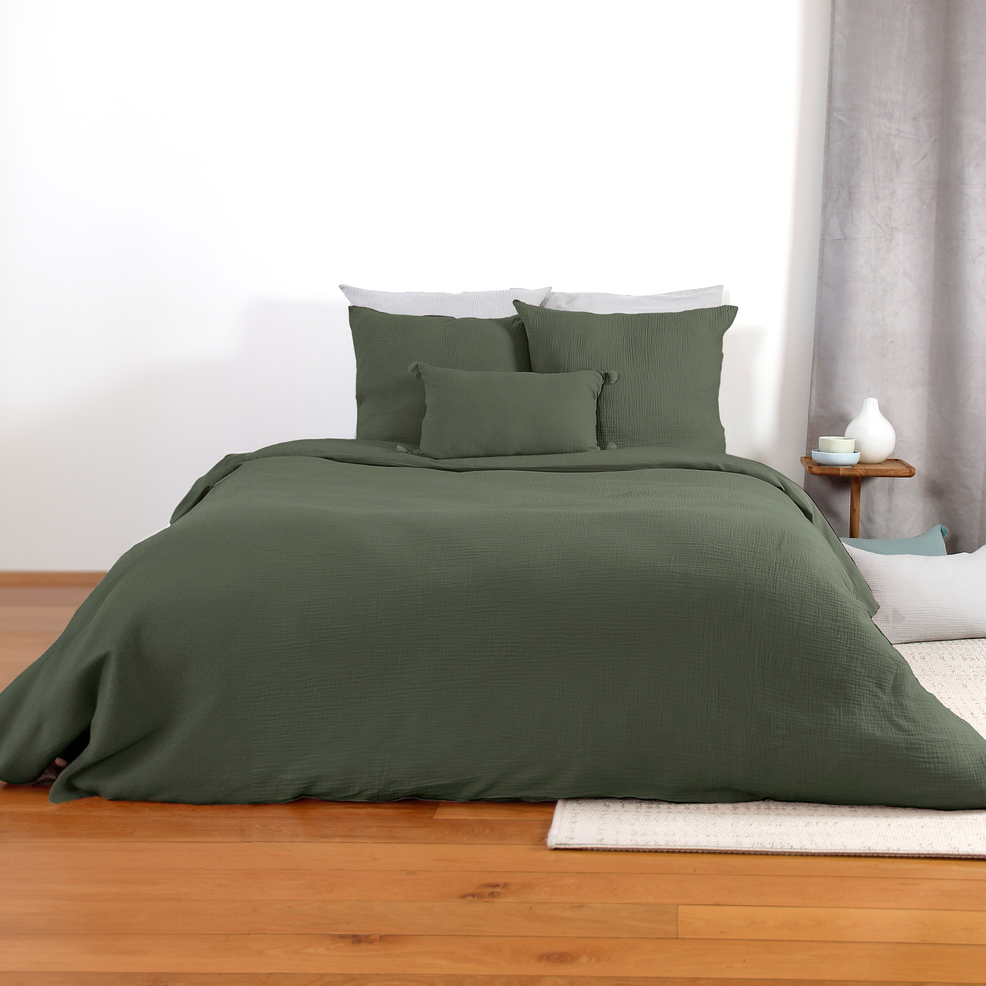 Parure de lit 260x240 cm double gaze de coton GAZGAZ vert kaki 3 pièces