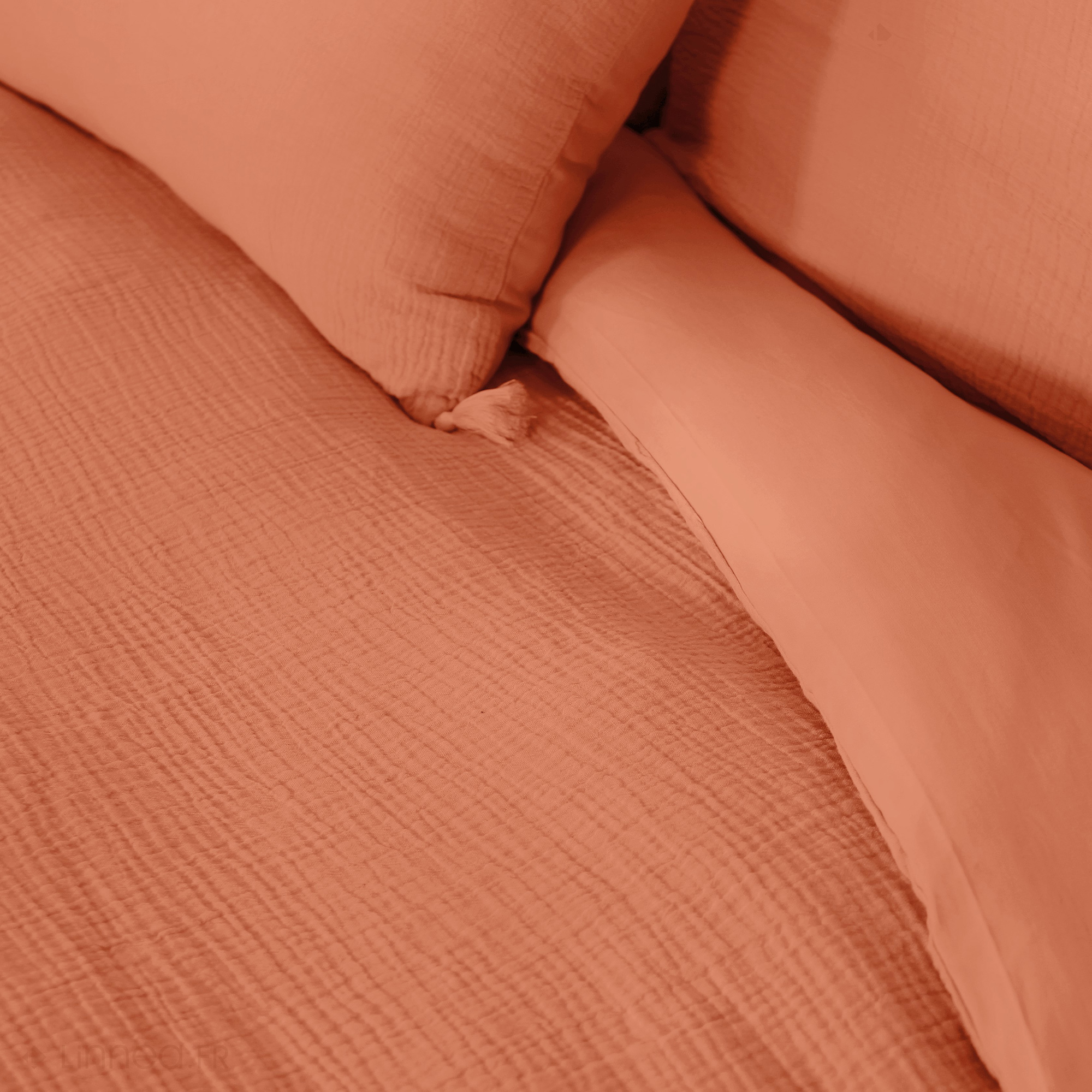 Améliorez la qualité de votre sommeil avec la parure de lit Gazgaz. Avec un côté 100% coton et un autre en double gaze de coton, elle vous apportera une douceur inégalée avec un effet gauffré et une grande facilité d'entretien. Le gaze de coton correspond à une superposition de deux tissus fins obtenus par un tissage de fils entrecroisés et assemblés par des points invisibles à intervalles réguliers. Vous aurez le choix entre plusieurs couleurs automnales pour une ambiance cocooning garantie !