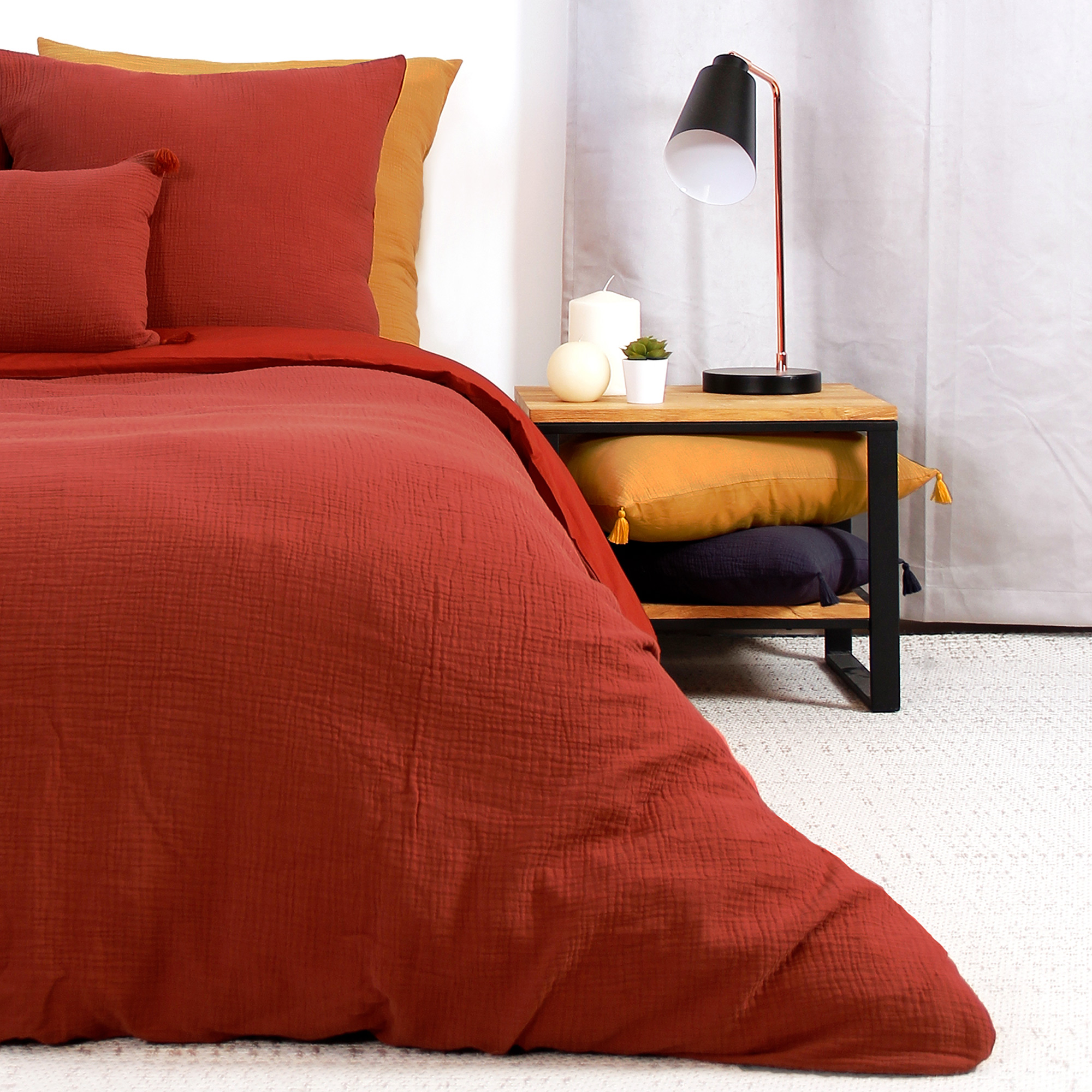 Parure de lit 140x200 cm double gaze de coton GAZGAZ rouge ocre 2 pièces