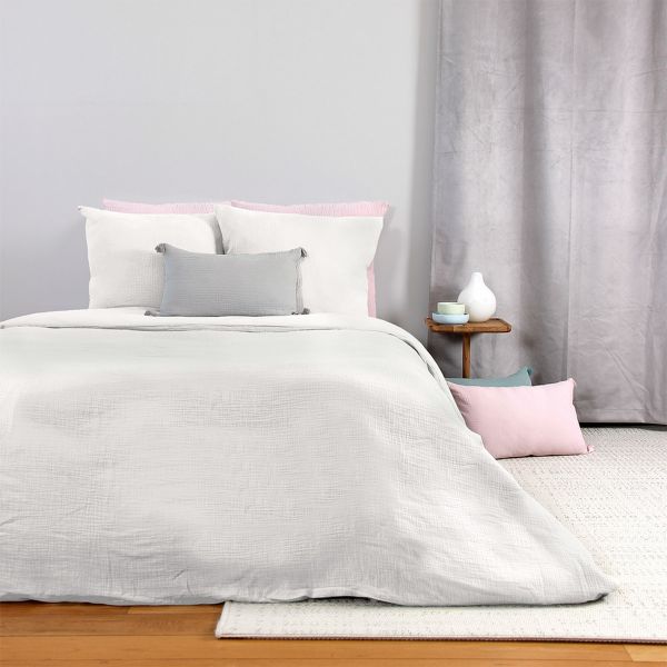 Sublimez votre lit avec la collection Housse De Rêve et la Parure de lit - Housse de couette 100% Gaze de Coton Blanc PARURE DE COUETTE 100% GAZE DE COTON Parure de lit comprenant : housse de couette + taie d'oreiller 63x63cm La gaze de coton est constituée de deux epaisseurs tissées ensemble et reliées par des petits points. Ultra douce, elle offre un bel aspect gaufré, moelleux à souhait. Avec son côté naturellement souple et léger, la gaze de coton nous enveloppe dans la douceur des langes ! Caractéristiques de la housse de couette et de la taie d’oreiller : Matière : 1 face 100% gaze de coton et 1 face confort coton 57 fims/cm2 Finition : housse de couette boutons, Taie forme sac Entretien : Housse de couette et taie d’oreiller lavable à 40°C Laver sur l’envers afin de protéger les couleurs, ne nécessite aucun repassage Produit certifié Oeko-Tex® : Le label Oeko-Tex® garantit que les articles testés et certifiés ne présentent pas de substances nocives substances pouvant nuire à la santé.' - Finition dessin taie : Dessin non placé (motifs aléatoires) - Finition dessin housse : Dessin non placé