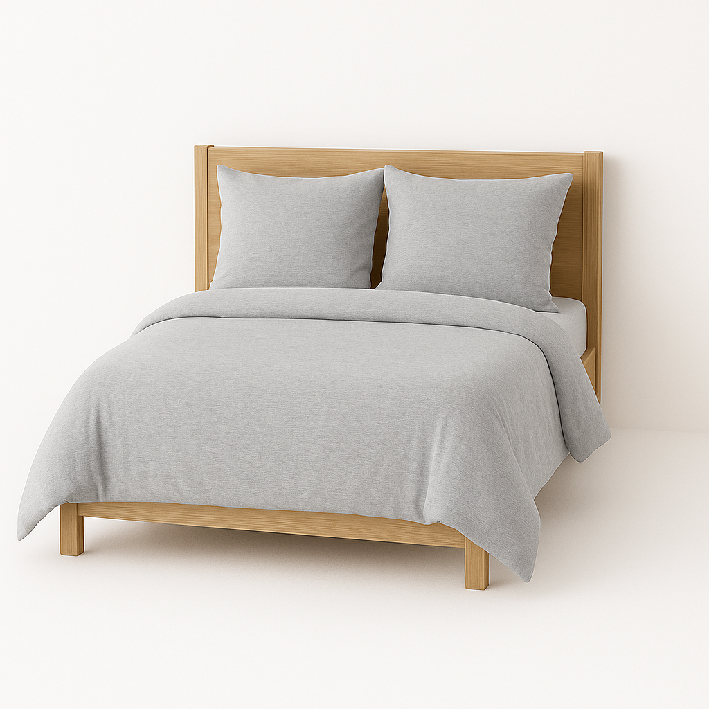 Parure de lit 2 personnes 1 housse de couette 220 x 240 + 2 taies d'Oreillers 60 x 60 Tissu Jersey 100% Coton couleur Gris clair Fermeture par boutons pour faciliter la mise en place Lavage Délicat à l'eau tiède/cycle délicat