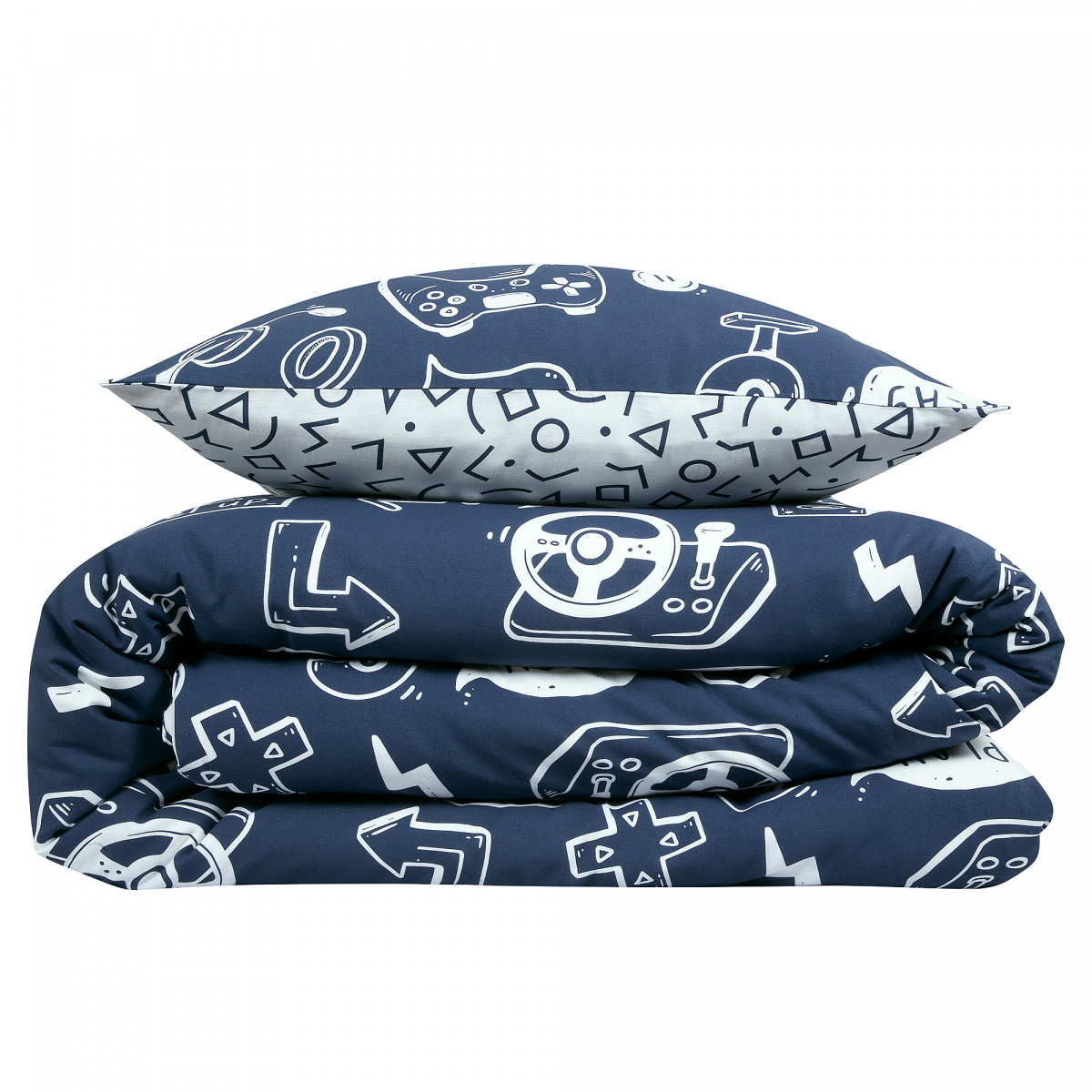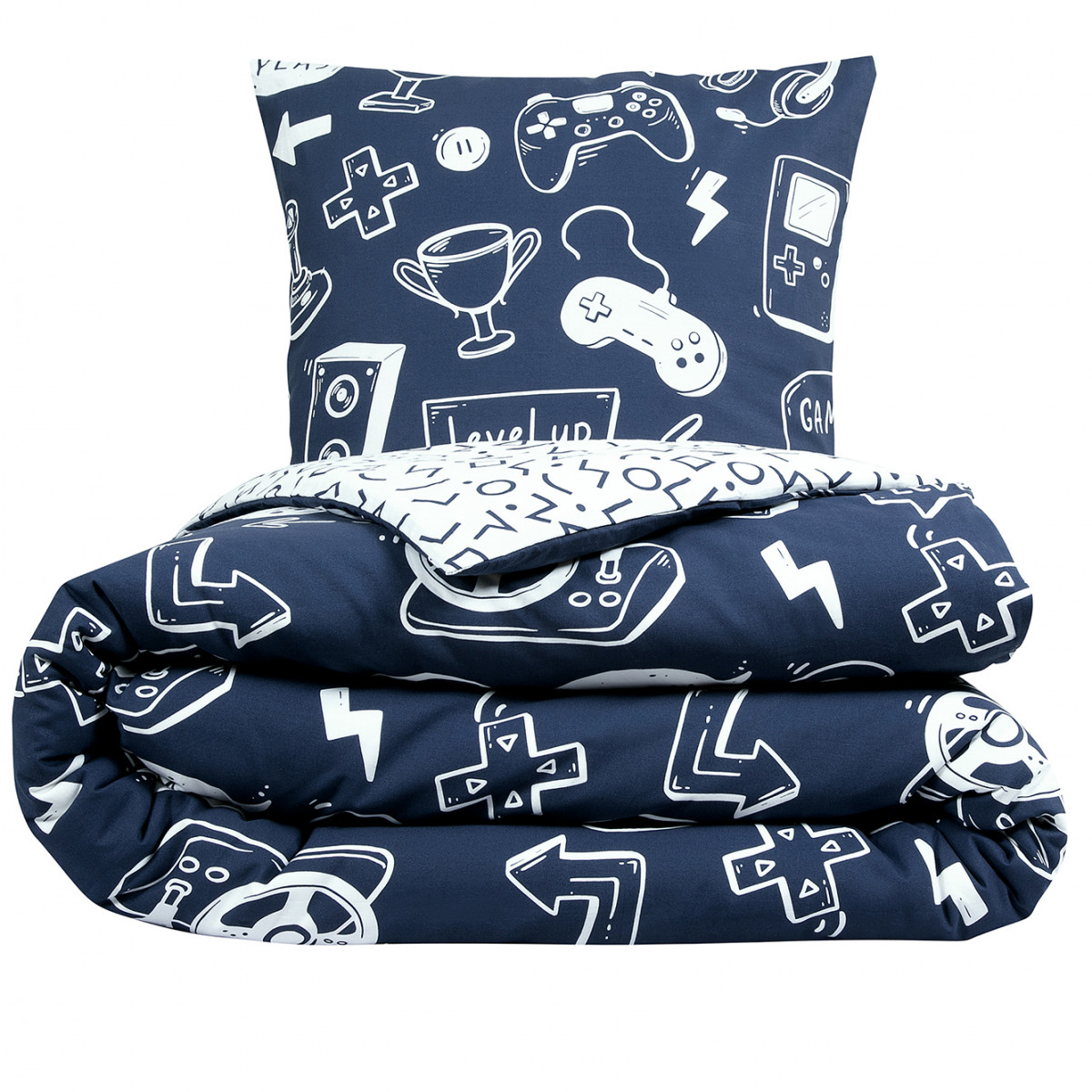 Avec son imprimé blanc inspiré de l'univers gaming sur un fond bleu marine, cette parure plonge votre espace dans une ambiance dynamique et moderne. Parfaite pour les amateurs de jeux vidéos, elle apporte une note originale tout en s'intégrant facilement à votre décoration.