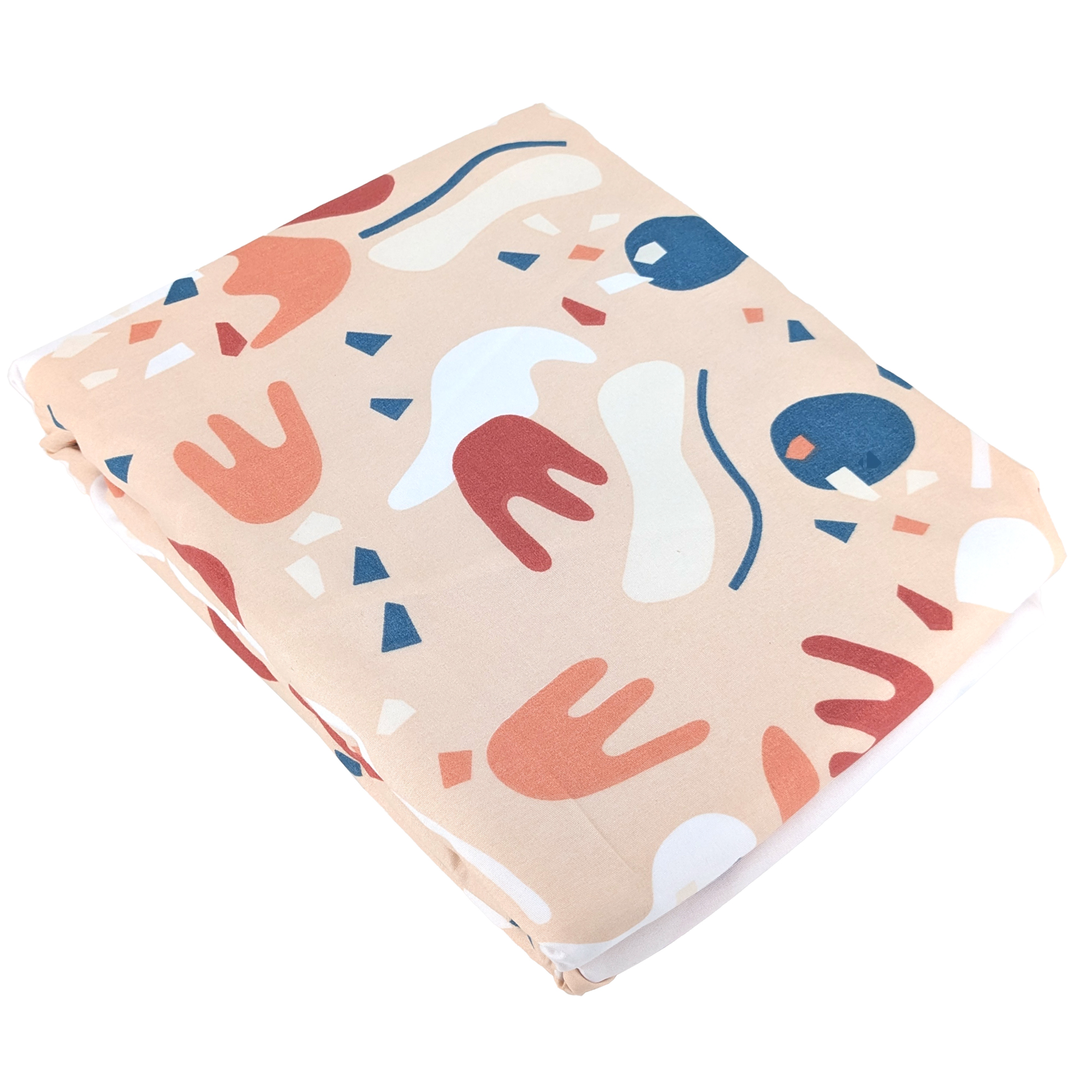 Housse de couette reversible avec deux faces différentes, sur une face un imprimé abstrait de petites formes en all-over, et sur l'autre face un uni blanc. Finition sans rabat aux pieds et fermeture par boutons pressions.