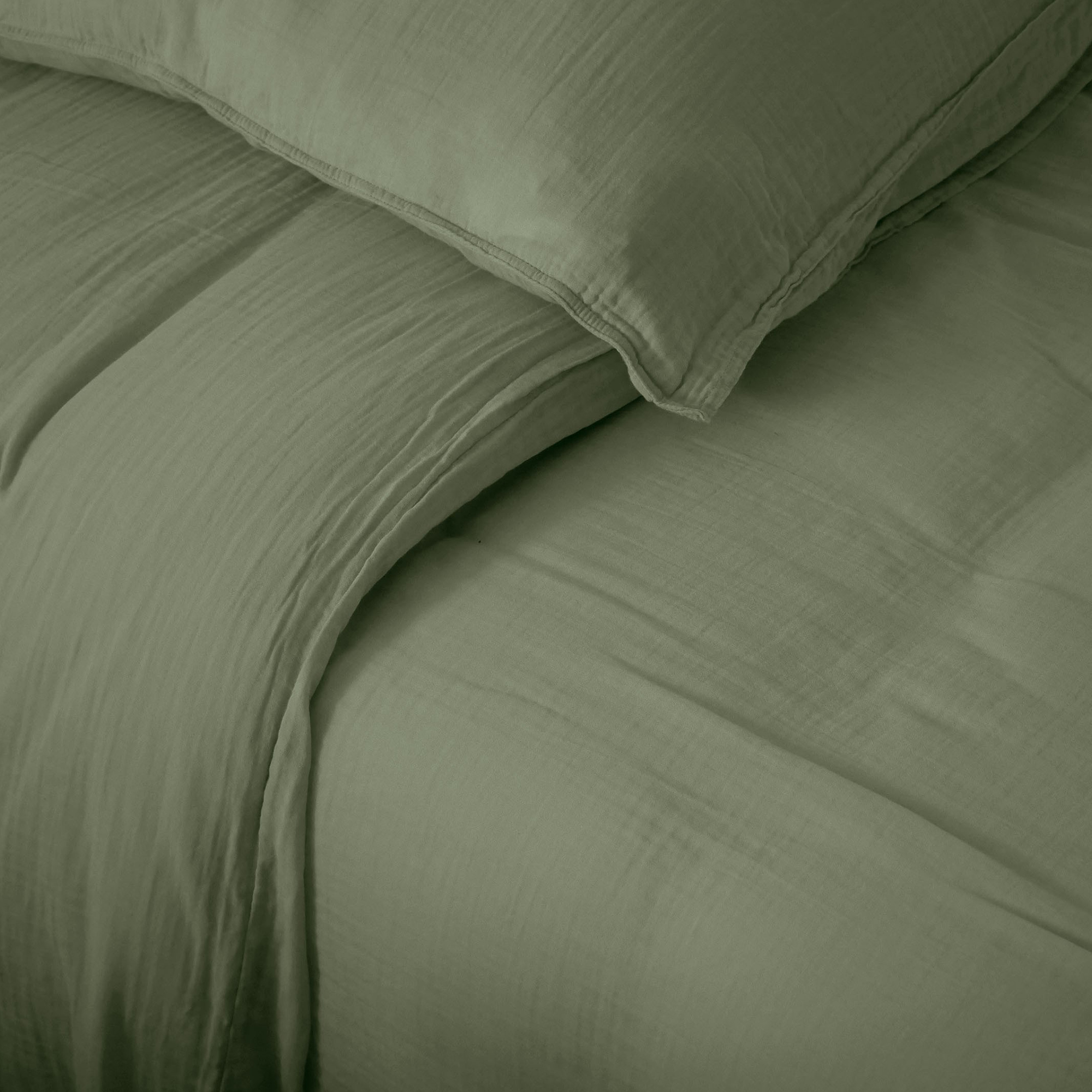 Parure de lit 3 pièces 260x240 cm et 65x65 cm mousseline de coton MILOS vert mousse
