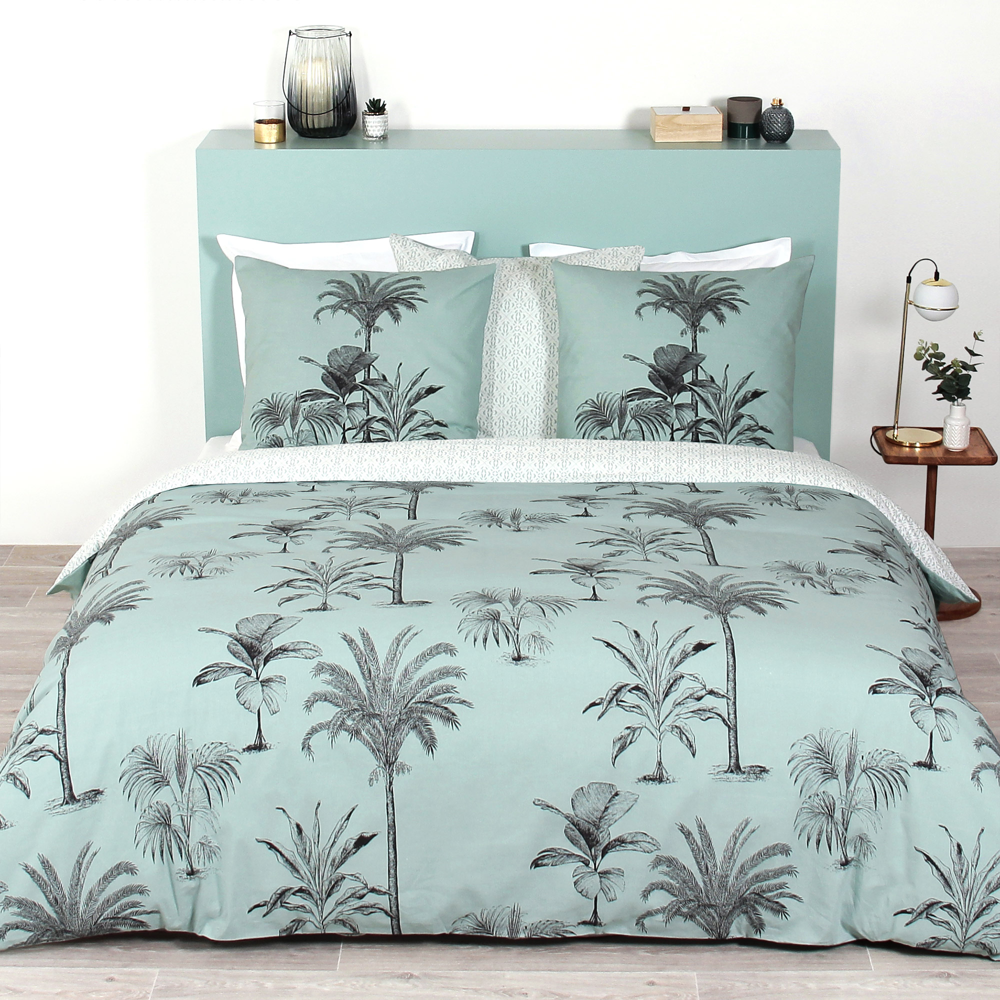 Housse de couette avec une face imprimée motif palmiers et plantes crayonnés dans des tons de gris sur fond bleu océan, sur l'autre face allover de petits motiffs abstraits sur fond blanc. Finition sans rabat aux pieds, fermeture par boutons, et passe-mains pour enfiler la couette facilement.