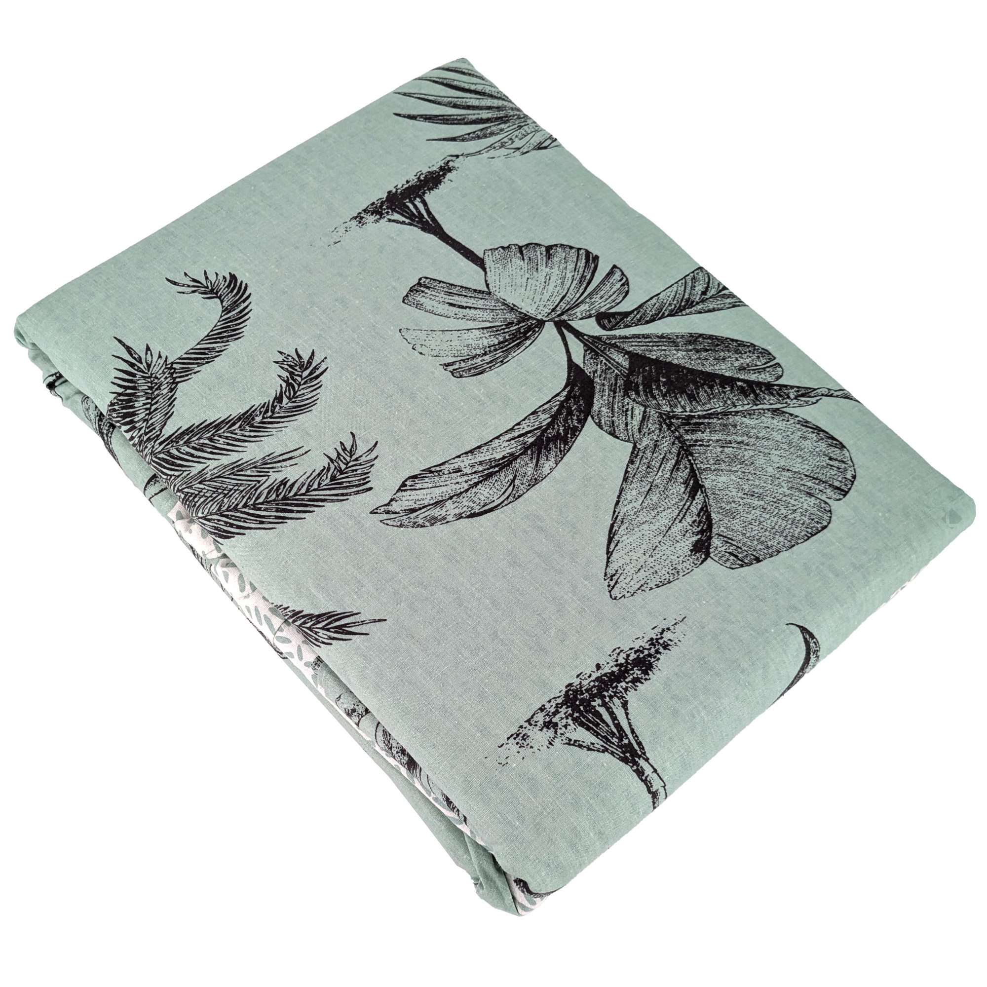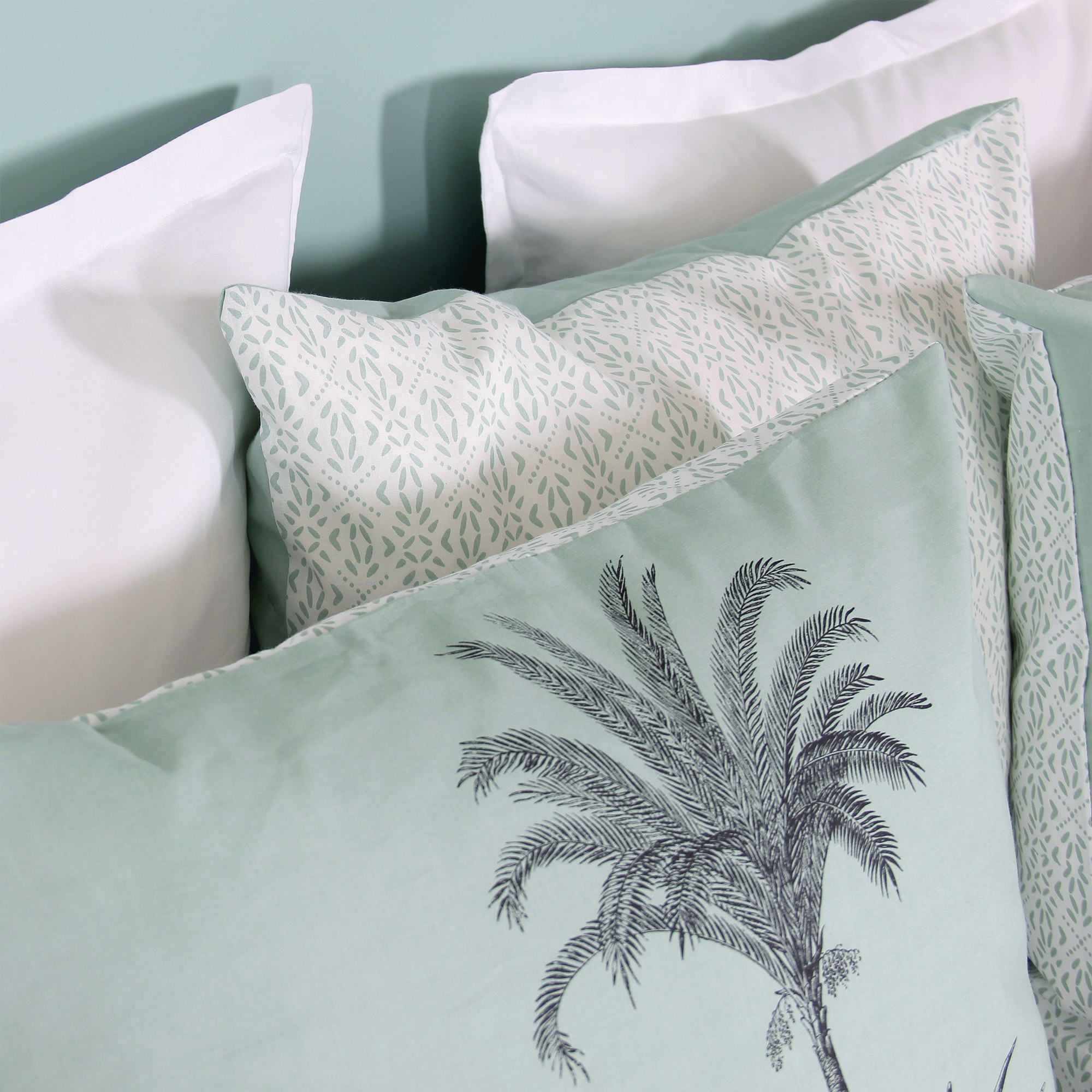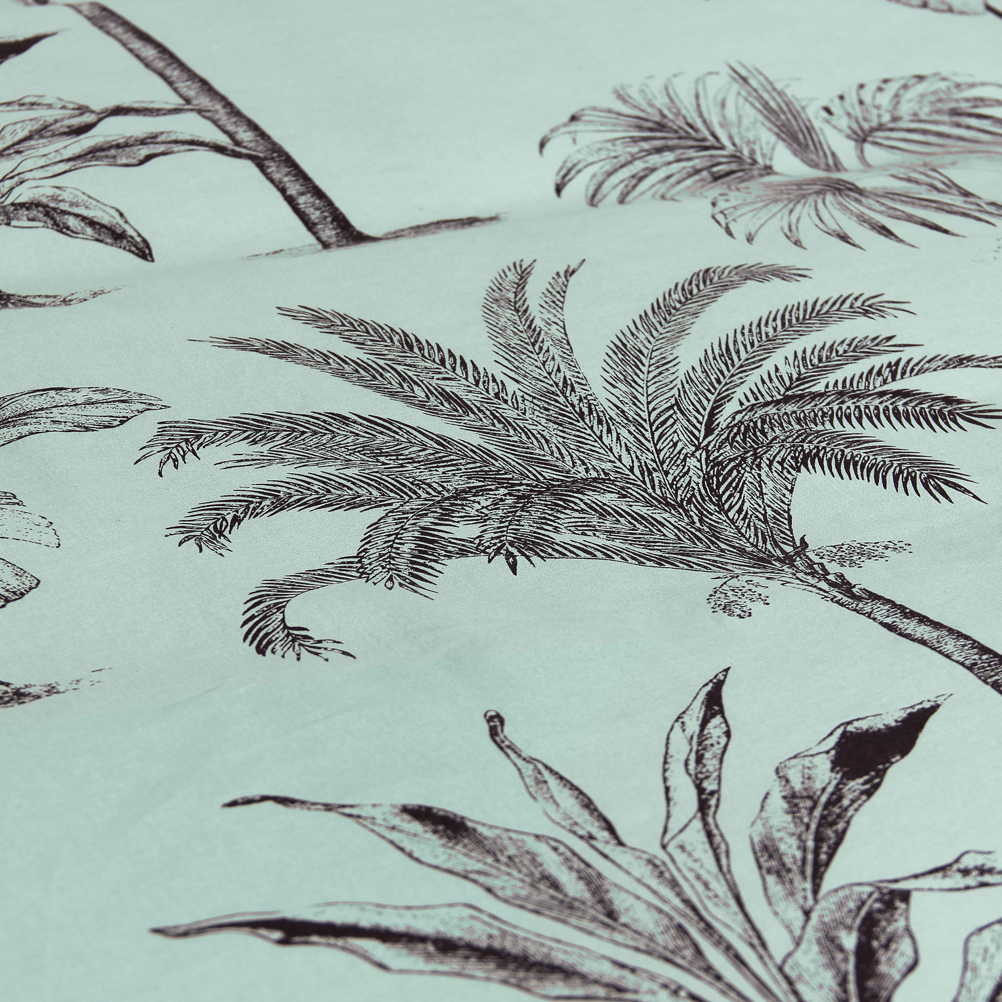 Ambiance jardin des plantes avec cette parure de lit imprimée de palmiers et plantes crayonnés dans des tons de gris sur fond bleu océan. La collection linge de lit PASSADA BLEU OCÉAN en coton issu de l'agriculture biologique est idéale pour une décoration de chambre originale.
