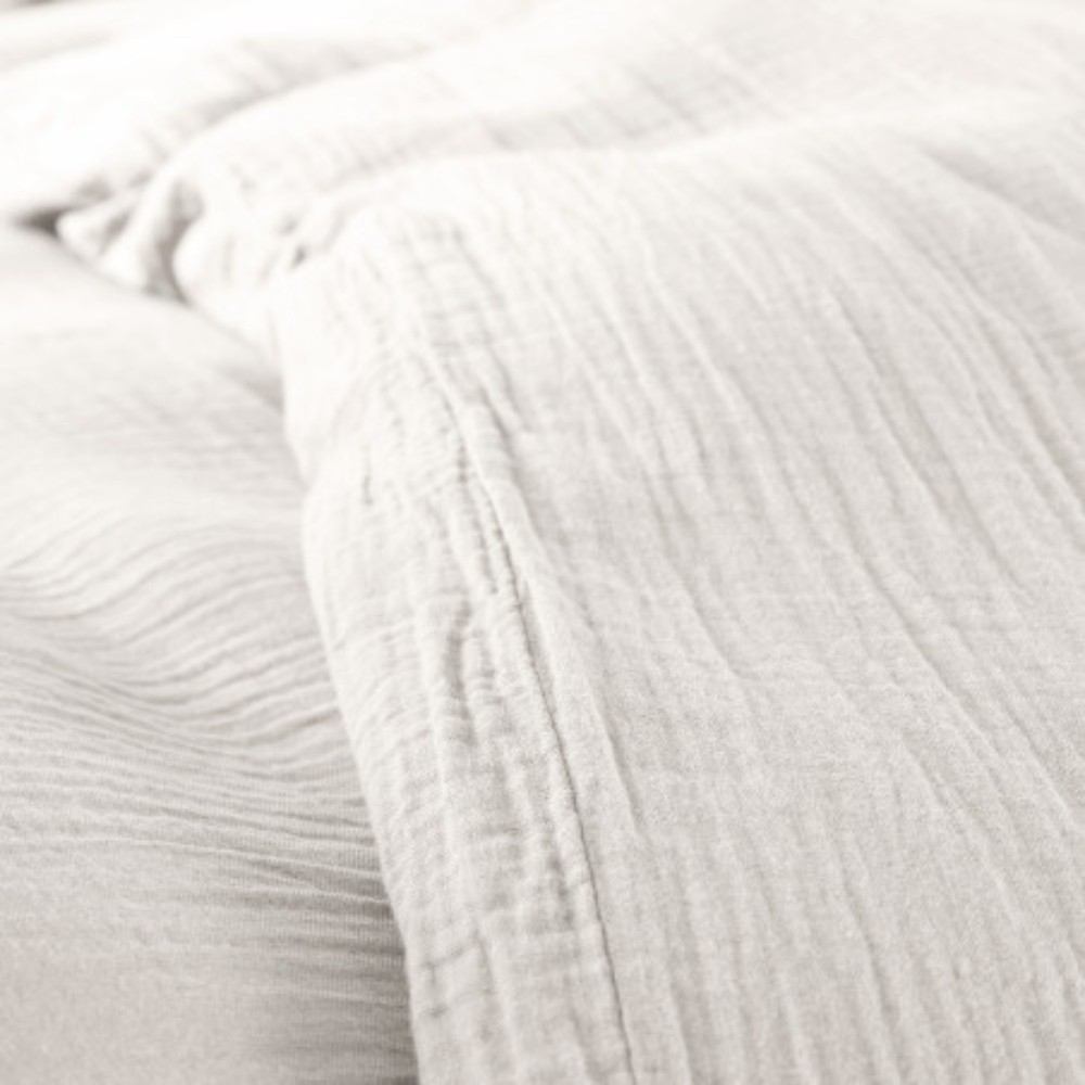 La housse de couette est réversible : une face en gaze de coton au style naturel et léger, et une face en coton classique, plus douce pour la peau et plus résistante. Idéale pour les gros dormeurs qui recherchent à la fois confort et durabilité.