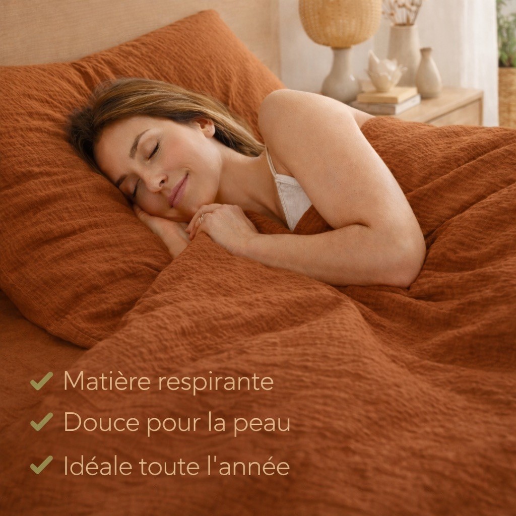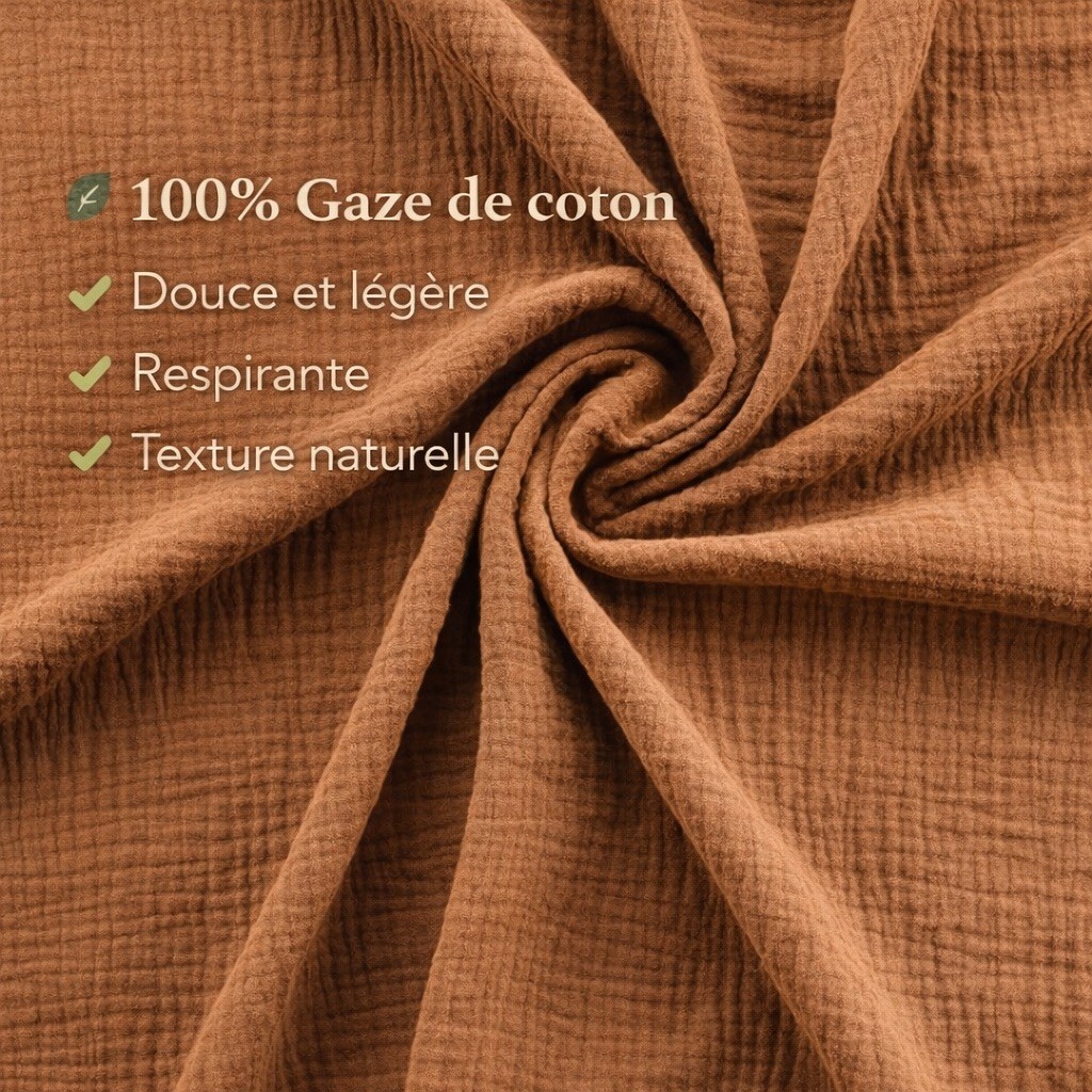Ce tissu en gaze de coton tissée 57 fils/cm2 saura vous tenir chaud en hiver et tempérée la température en été pour des nuits confortable.