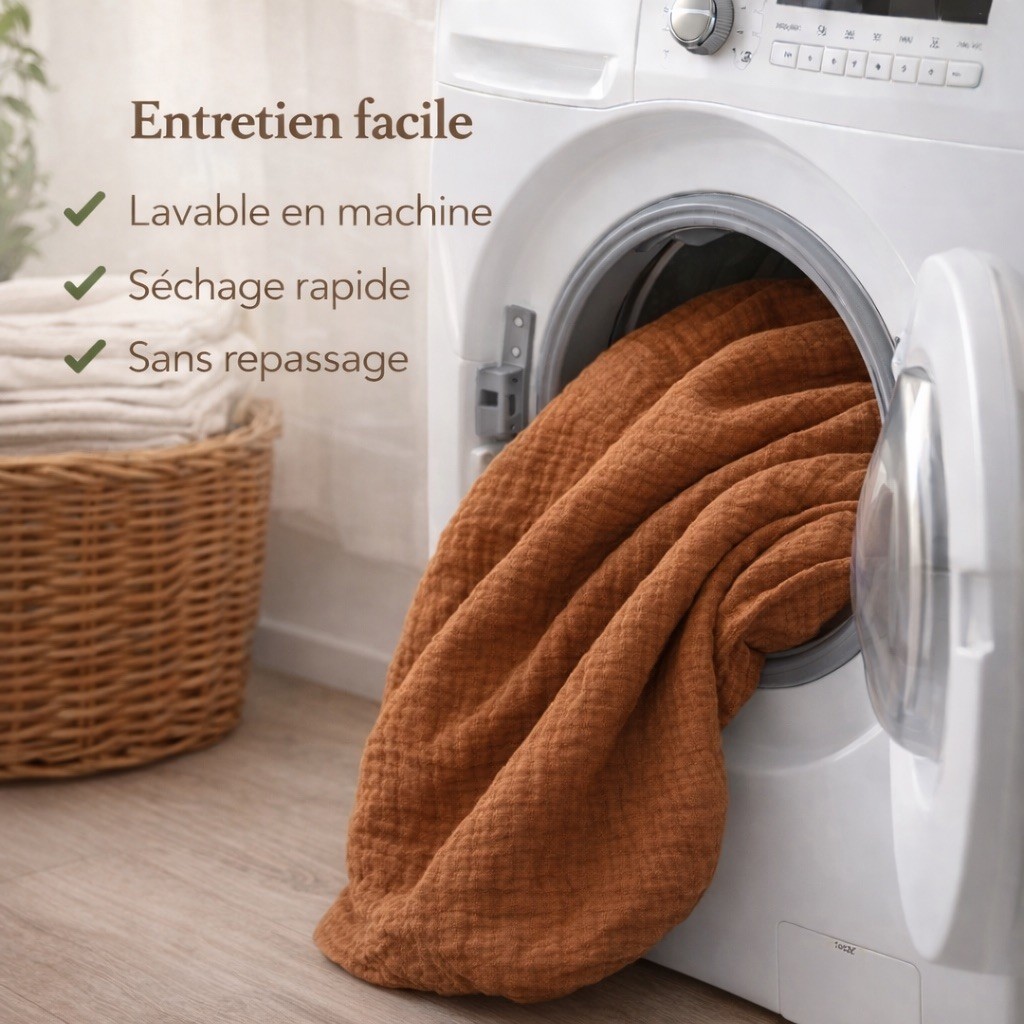 Nous vous recommandons de suivre nos conseils d'entretien pour conserver la qualité de votre linge : - Température de lavage 40° - Séchage en tambour faible - Température de repassage faible - Pas de nettoyage à sec