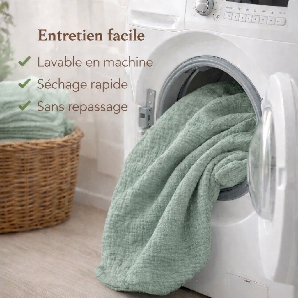 Nous vous recommandons de suivre nos conseils d'entretien pour conserver la qualité de votre linge : - Température de lavage 40° - Séchage en tambour faible - Température de repassage faible - Pas de nettoyage à sec