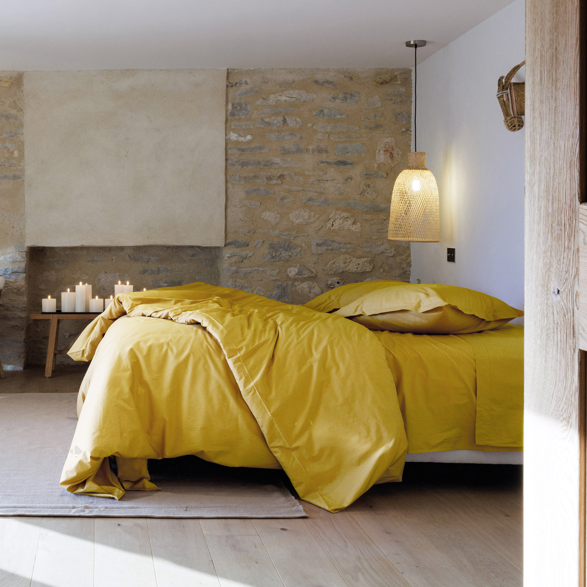 | Plus produit | Parure de lit 240x220 cm et taie d'oreiller 65x65 cm coloris jaune Moutarde uni, collection MANOIR 100% percale de coton tissage 80 fils/cm2 très serrés, doux au toucher, respirant et très résistant |