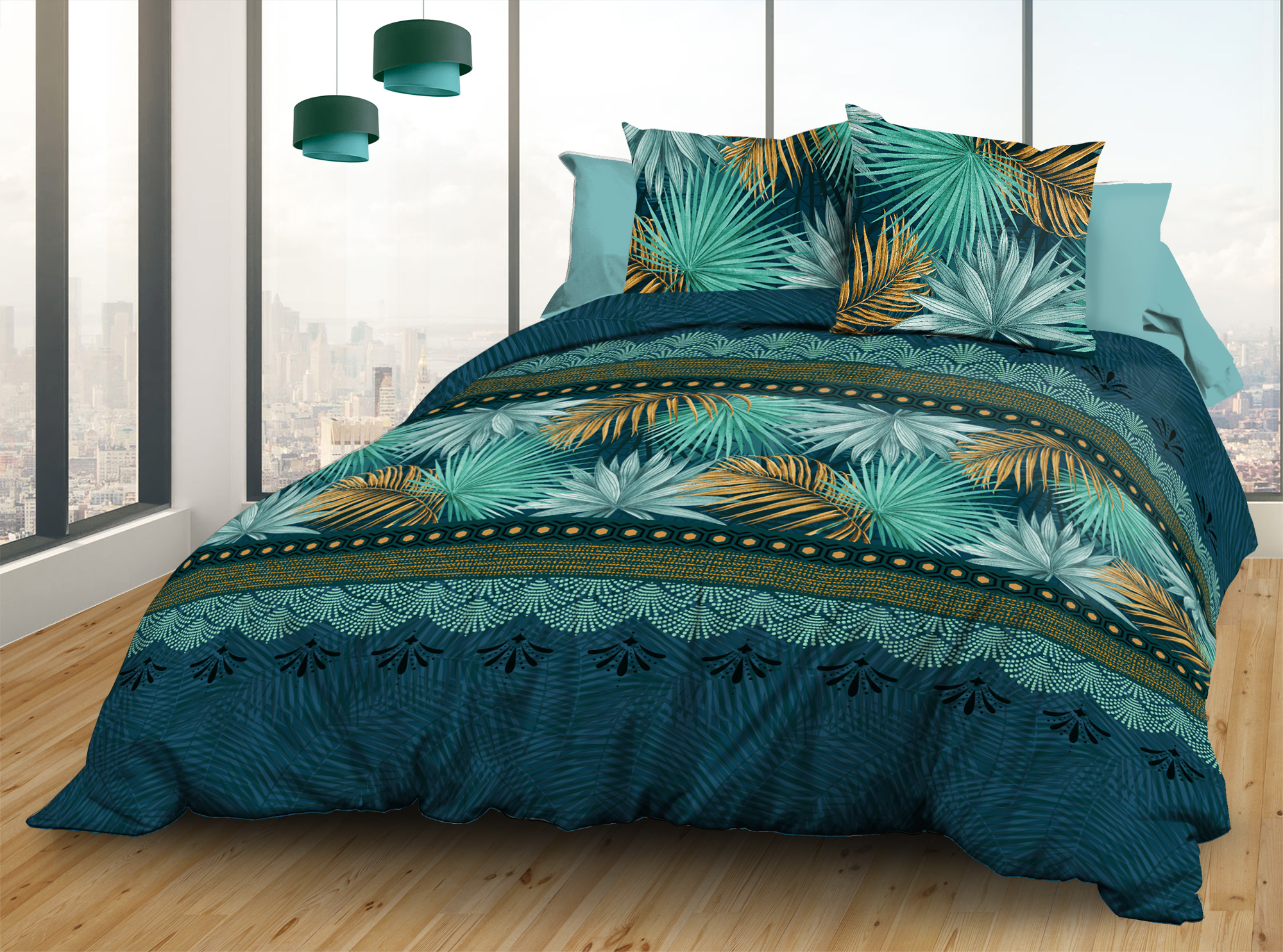 Ensemble pour lit 2 personnes 160x200 cm - Pur coton imprimé, tissage serré (57 fils/cm2) - Composé d'un drap housse 160x200 cm avec un bonnet de 25 cm, 1 drap plat 240x300 cm et 2 taies d'oreiller 63 x 63 cm - 100% coton