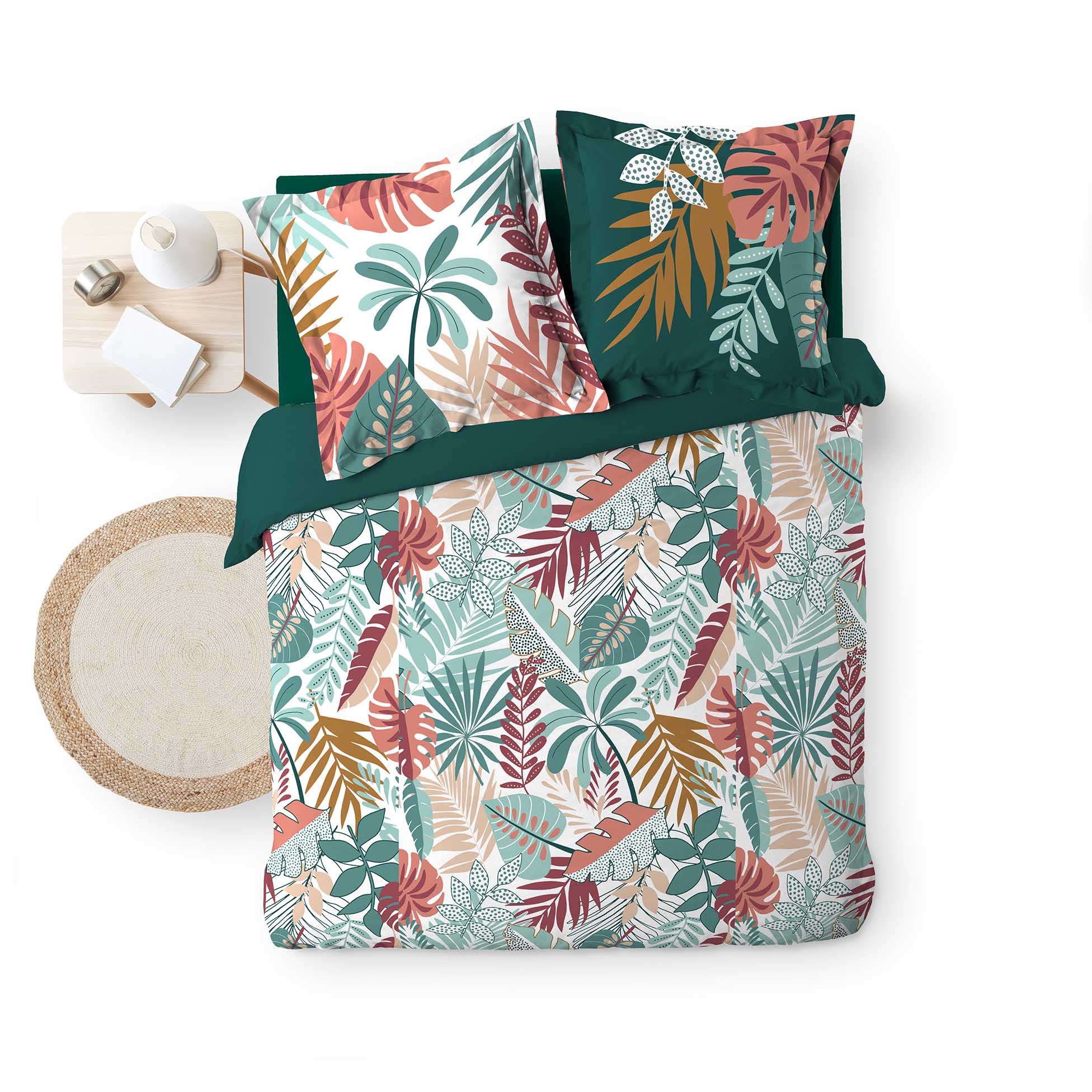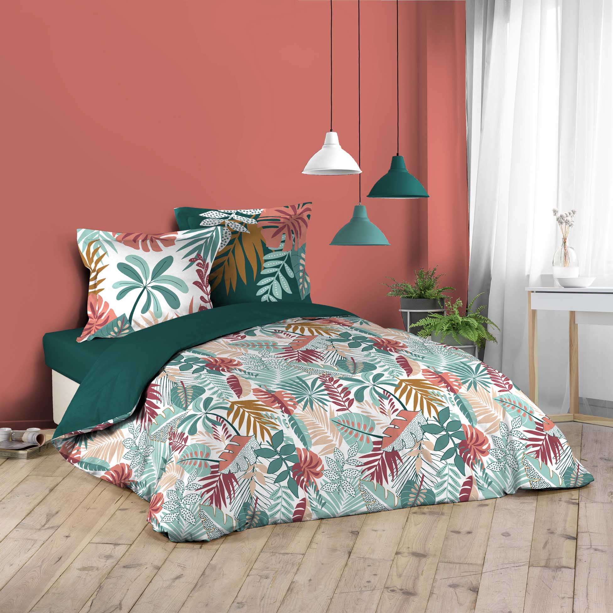 Parure Housse de couette + taies Feuilles Jacalas Pour lit 2 personnes. Dimension de la housse de couette : 200 x 220 cm + 2 Taies d'oreiller : 63 x 63 cm. Une ambiance Tropicale à la décoration de votre chambre avec cette housse de couette et son motif Floral   Couleur: Multicolore Composition: Qualité supérieure 100% Coton Entretien: Lavage à 40° - Séchage modéré - Repassage à 150° Finition: Coton Imprimé 42Fils/cm² - Fermeture Boutons-Pressions Certification Oeko-Tex® Garantit que les articles testés et certifiés ne présentent pas de substances nocives pouvant nuire à la santé.   Les accessoires présents sur le visuel ne sont pas vendus avec la parure.   Recommandation : Laisser tremper le linge une nuit dans une bassine d'eau froide afin de dissoudre les apprêts et les pigments résiduels de teinture. Nous vous conseillons d'utiliser le gros sel comme fixateur avant le lavage et de limiter la friction en machine pour eviter une decoloration. Retrouvez également des Rideaux, Coussins dans la même collection pour coordonner votre intérieur.