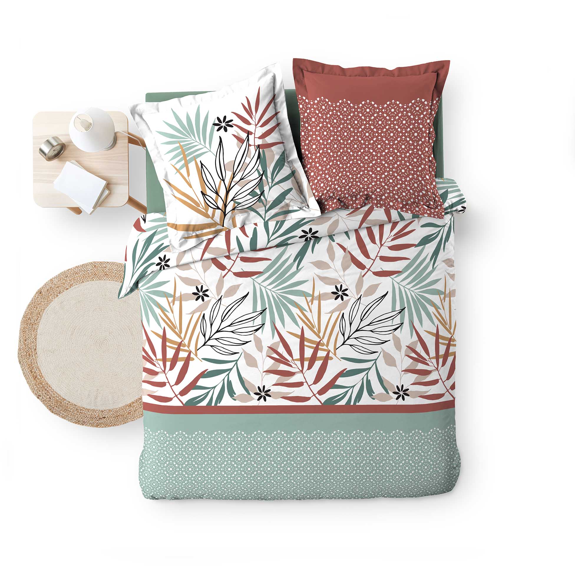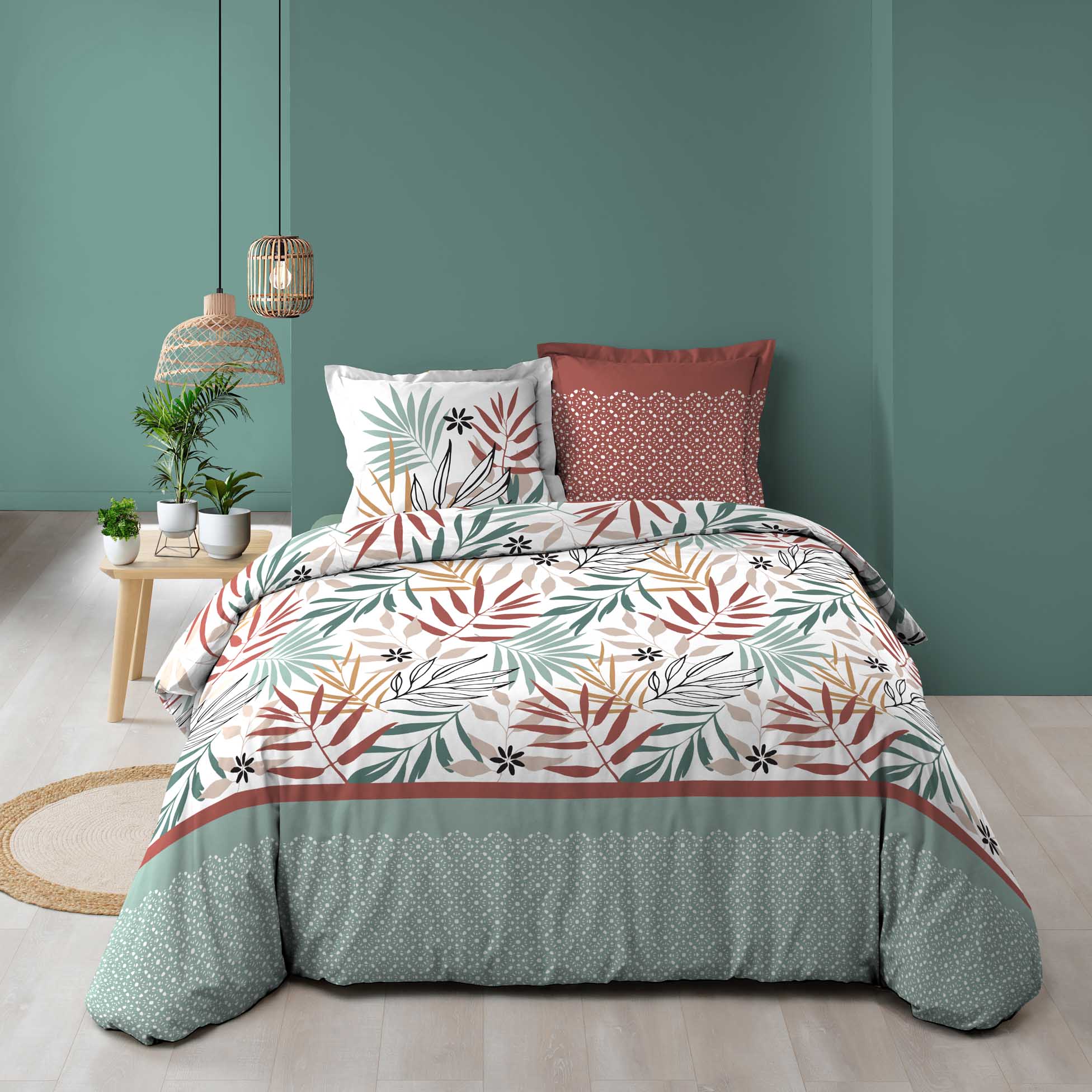 Parure Housse de couette + taie Floral Pour lit 2 personnes. Dimension de la housse de couette : 240 x 220 cm + 2 Taies d'oreiller : 63 x 63 cm. Une ambiance élégante et de style à la décoration de votre chambre avec cette housse de couette et son motif feuiles Couleur: multicolore Composition: Qualité supérieure 100% Coton dessin placé. Entretien: Lavage à 40° - Séchage modéré - Repassage à 150°. Finition: Coton Imprimé 57Fils/cm² - Fermeture Boutons-Pressions . Certification Oeko-Tex® Garantit que les articles testés et certifiés ne présentent pas de substances nocives pouvant nuire à la santé. Les accessoires présents sur le visuel ne sont pas vendus avec la parure. Recommandation : Laisser tremper le linge une nuit dans une bassine d'eau froide afin de dissoudre les apprêts et les pigments résiduels de teinture. Nous vous conseillons d'utiliser le gros sel comme fixateur avant le lavage et de limiter la friction en machine pour eviter une decoloration. Retrouvez également des Rideaux, Coussins dans la même collection pour coordonner votre intérieur.