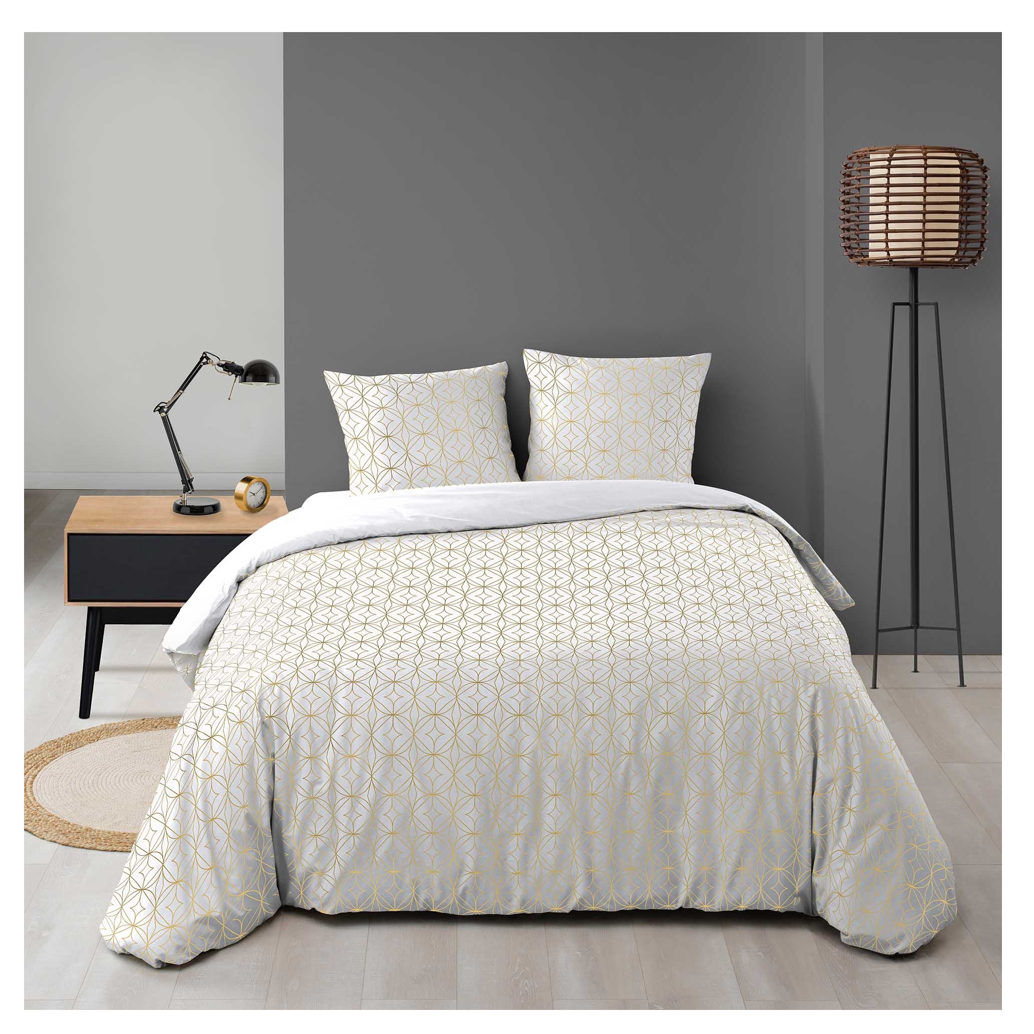 Parure Housse de couette + taie Un style tres tendance et ultra moderne à la décoration de votre chambre avec cette housse de couette aux motifs Géometriques Composition: Qualité supérieure 100% polyester Entretien: Lavage à 30° - Pas de séchage - Repassage à 110° Finition: Polyester Imprimé or - Fermeture Boutons-Pressions Certification Oeko-Tex® Garantit que les articles testés et certifiés ne présentent pas de substances nocives pouvant nuire à la santé. Pour lit 2 personnes. Dimension de la housse de couette: 240 x 220 cm + 2 Taies d'oreiller : 63 x 63 cm. Les accessoires présents sur le visuel ne sont pas vendus avec la parure. Recommandation : Laisser tremper le linge une nuit dans une bassine d'eau froide afin de dissoudre les apprêts et les pigments résiduels de teinture. Retrouvez également des Rideaux, Coussins dans la même collection pour coordonner votre intérieur.