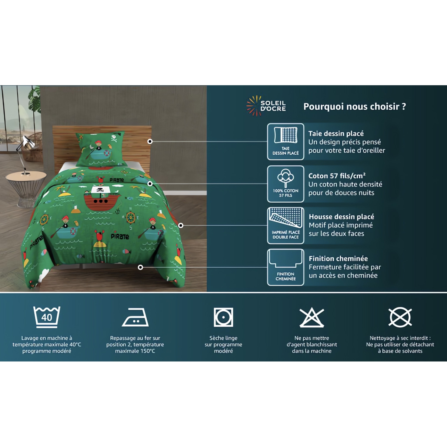 | Libellé | Parure housse de couette 140x200 cm POMPIERS, 100% coton 57 fils/cm2, par Soleil d'Ocre |