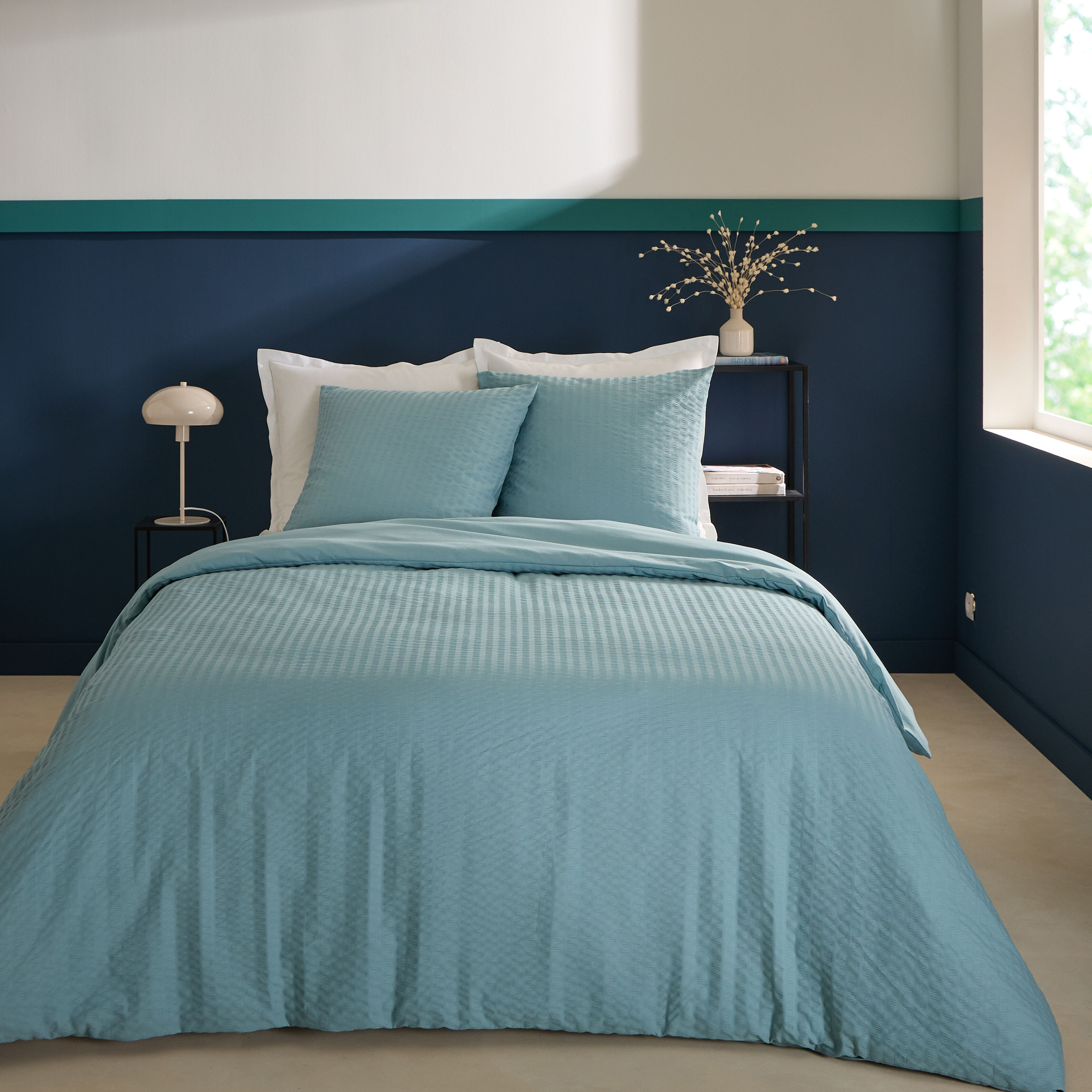 Parure housse de couette effet matière Seersucker 140x200cm avec 1 taie d'oreiller 63x63cm, coloris vert d'eau, 52% Polyester et 48% Coton, Tissaia