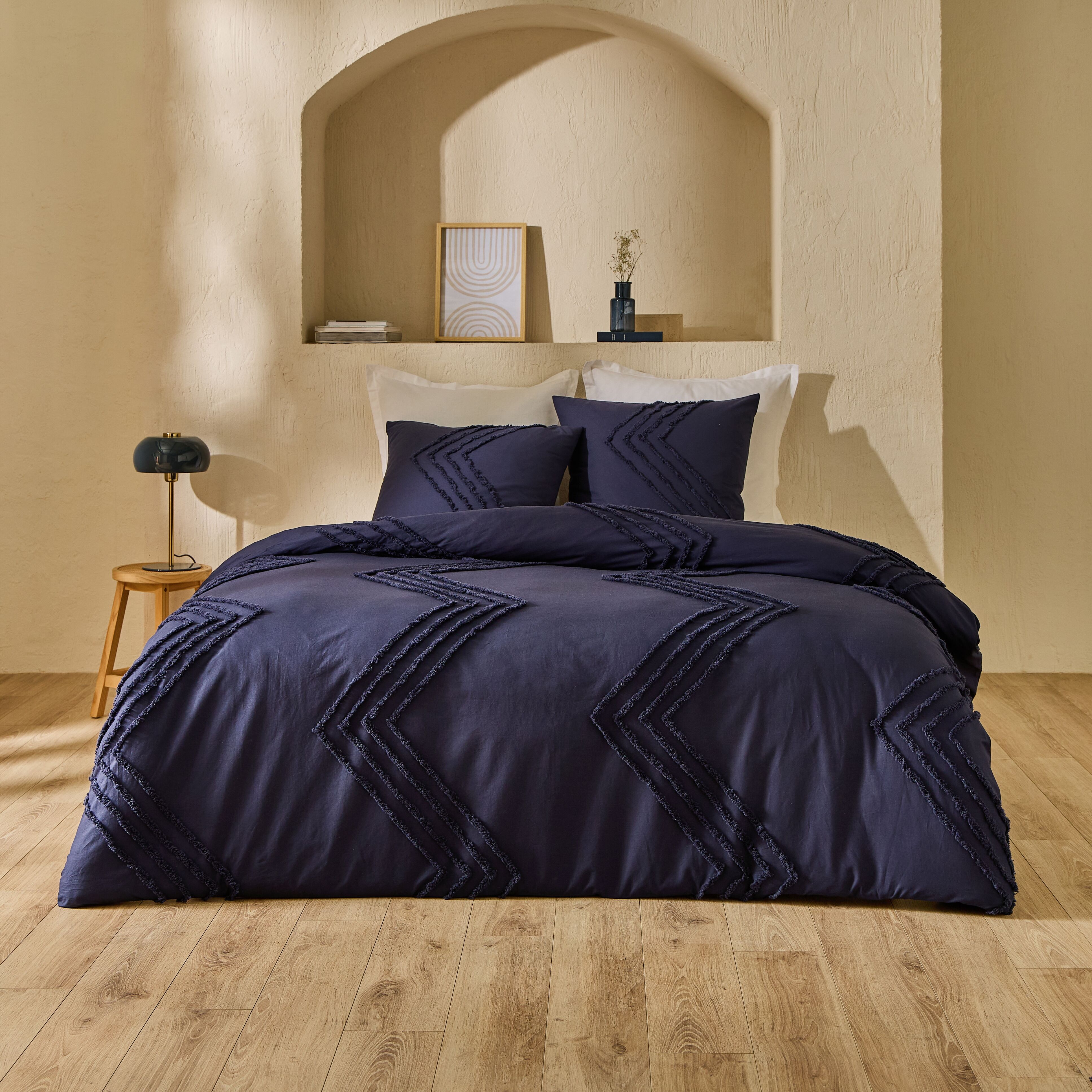 | Libellé | Parure housse de couette tuftée 260x240 Cm + 2 taies d'oreiller 63x63 Cm bleu marine TISSAIA |