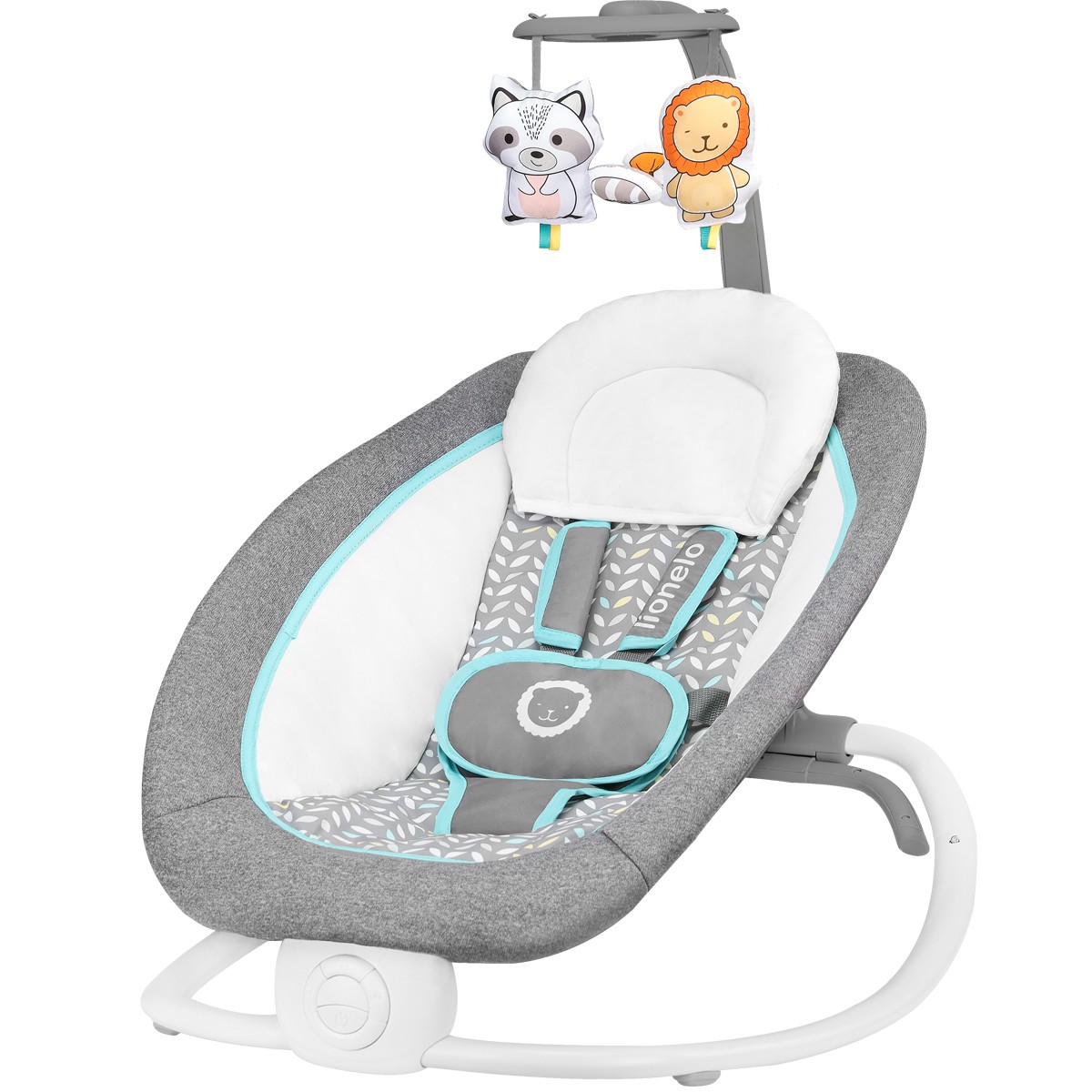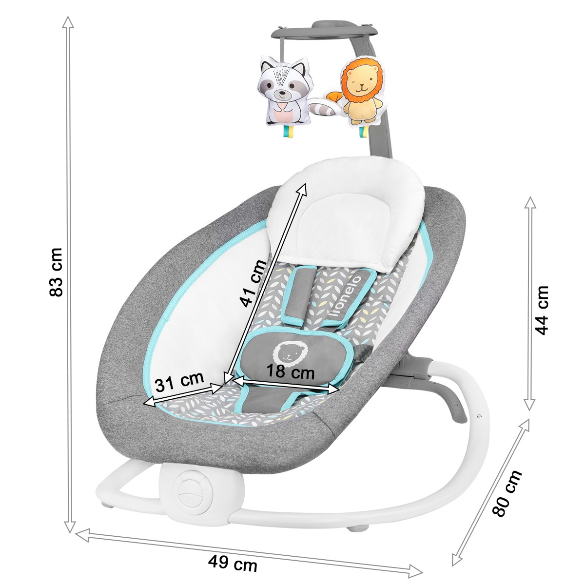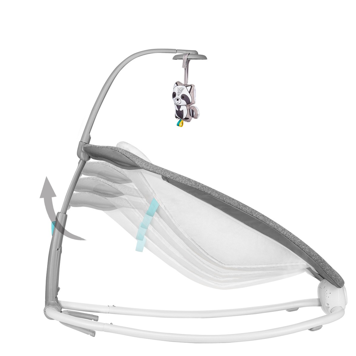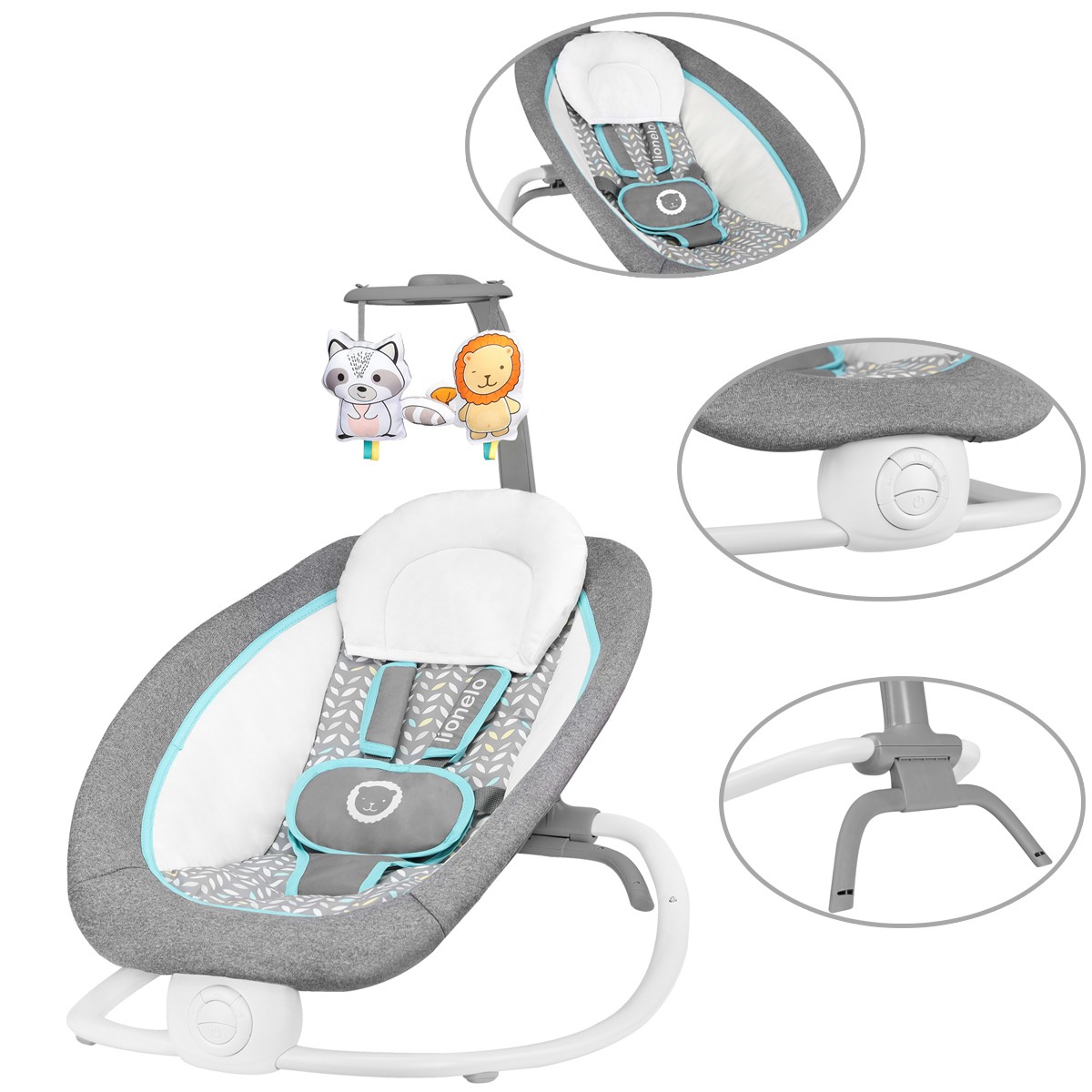 Ce transat bébé est équipé de pieds antidérapants, d'un harnais de sécurité à 5 points et d'un appui-tête rembourré et amovible. Le dossier du transat s'incline sur 4 positions au choix. Le transat se plie facilement. Il dispose également d'un mobile incluant 2 peluches suspendues.