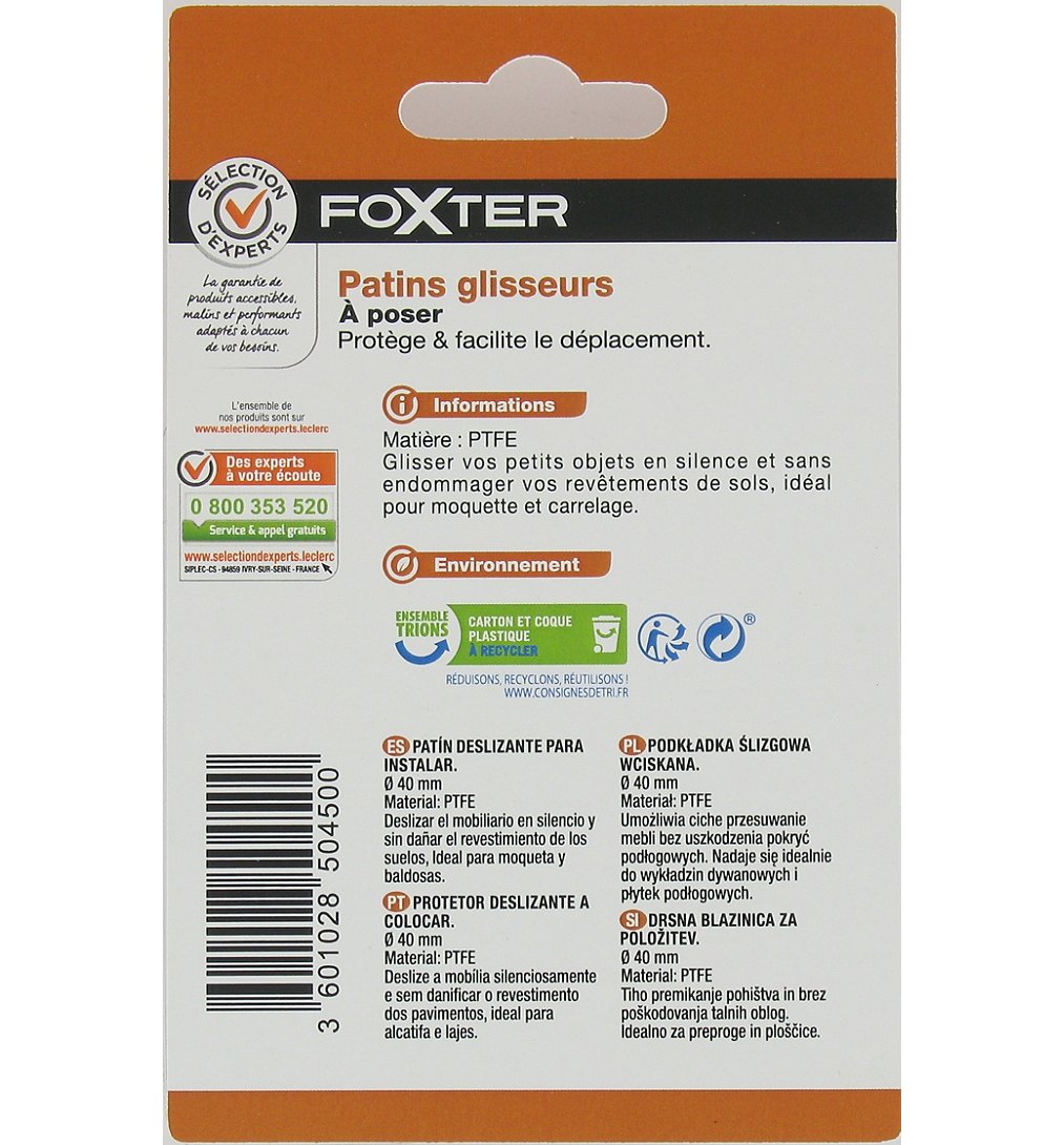 | Libellé | Patins glisseurs en téflon 40mm x4 - Sélection d'Experts - FOXTER |