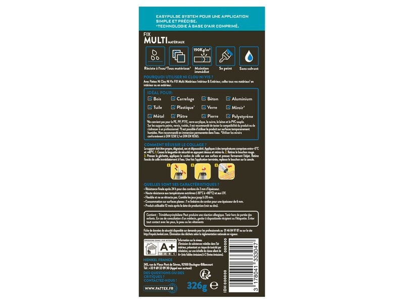 | Libellé | PATTEX Colle Fixation NCNV Tous Matériaux Intérieur et Extérieur MSP 326g |