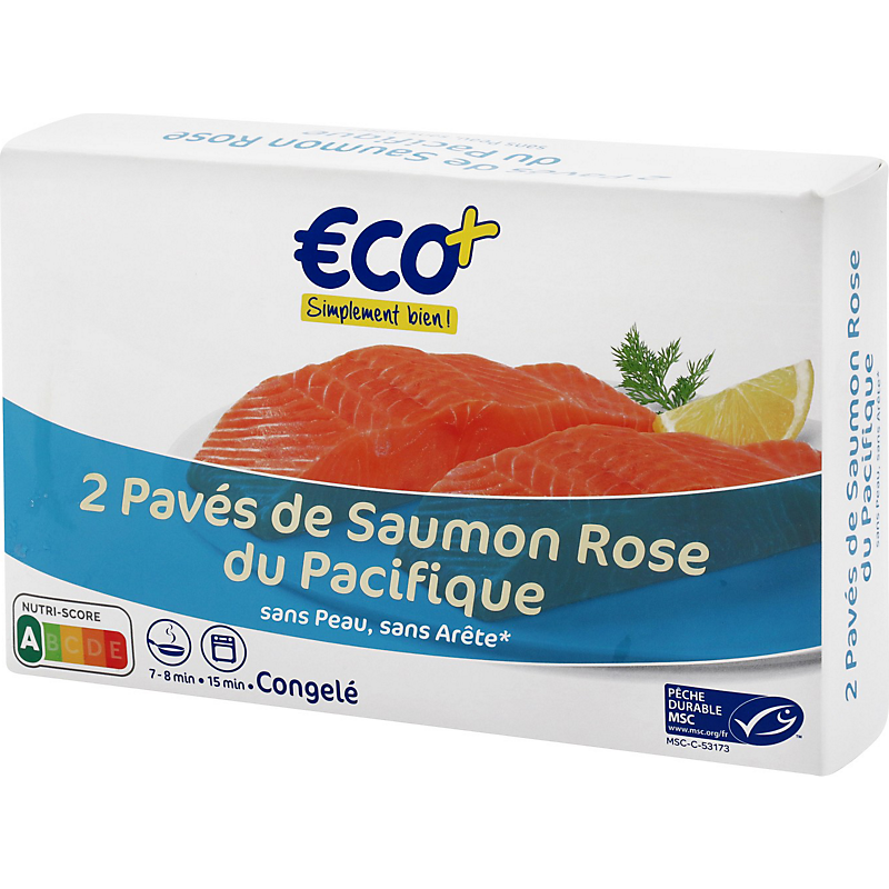 Pavés de saumon Rose du Pacifique* (Oncorhynchus gorbuscha), sans peau, sans arête, pêché en Océan Pacifique Nord-Est aux filets maillants et similaires et/ou aux filets tournants et filets soulevés - congelés *Qualité sans arête : bien qu'un soin tout particulier ait été pris pour éliminer toutes les arêtes, quelques unes peuvent exceptionnellement se retrouver dans le produit. ECO +