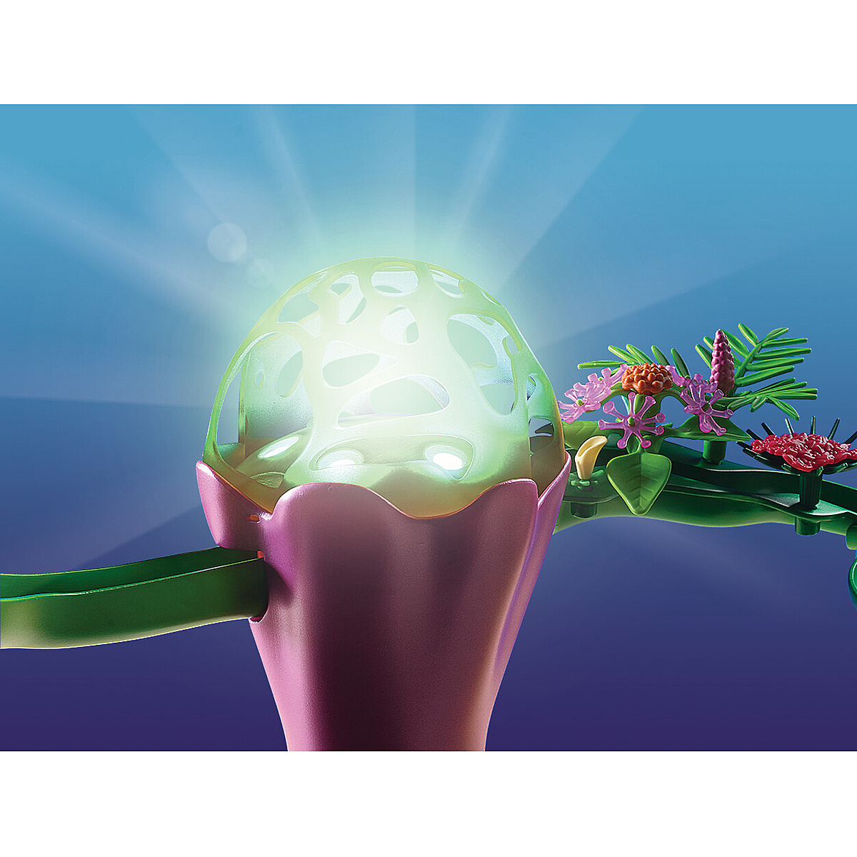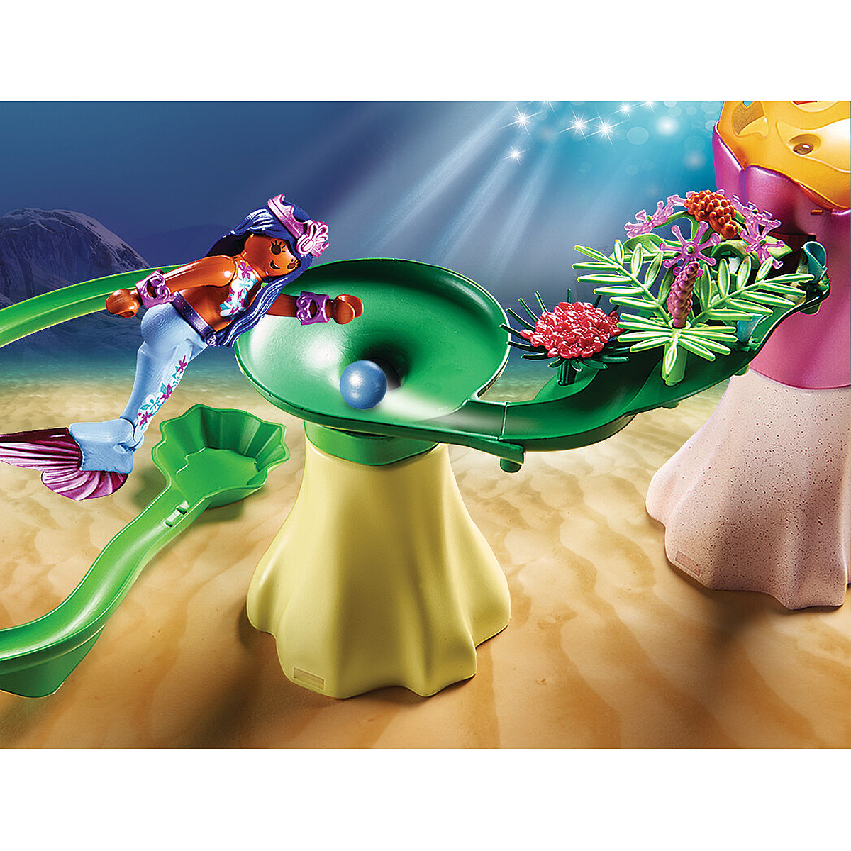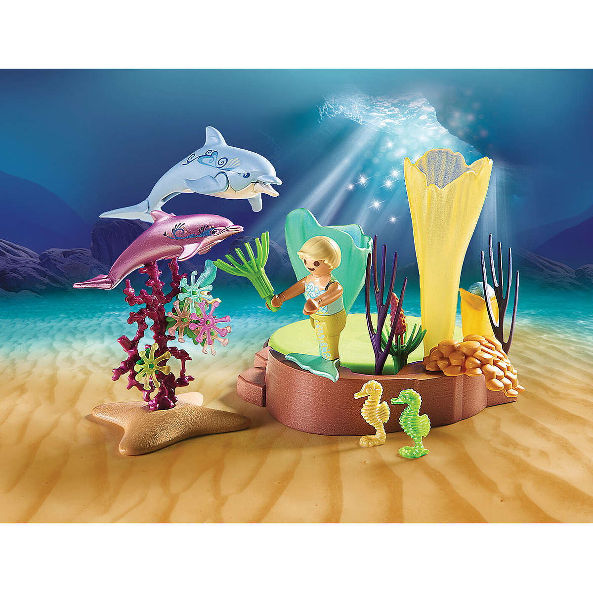 Quand les sirènes veulent s'abriter, elles se rendent sous le pavillon de corail. Le dôme lumineux (nécessite 3 piles AAA de 1,5 V non fournies) brille dès quune perle passe dessus. Avec piste de perles, perles à collectionner, créatures marines et de nombreux accessoires. Peut-être combiné avec le Salon de beauté et sirène Réf. 70096.
