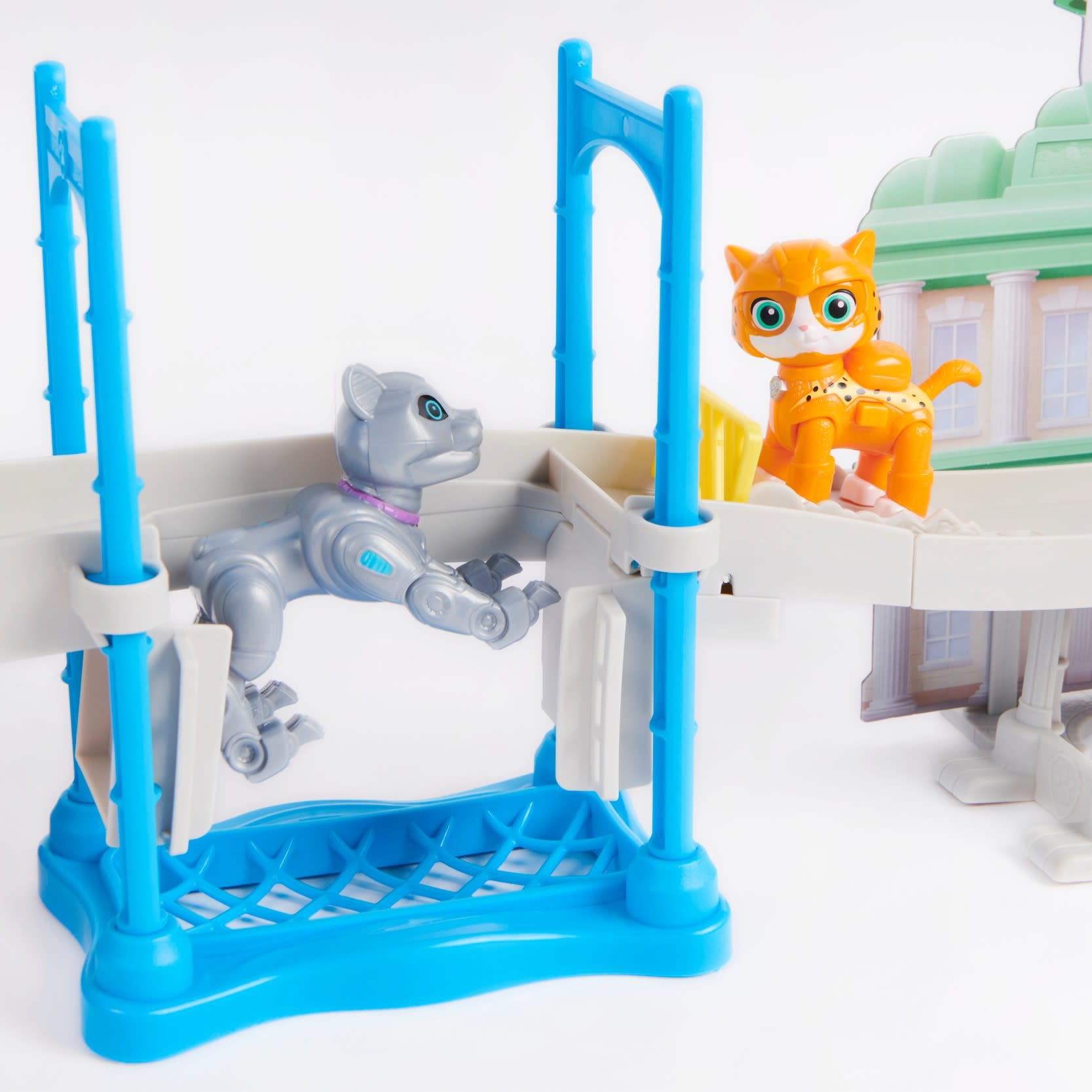 La Tour de contrôle de la Grande Vallée est attaquée. Meow-Meow, le tigre robot adore manger du métal, et a fait de la tour de la Pat'Patrouille son grattoir favori. Elle est couverte de griffures et marques de dents. Faites équipe avec le rapide Wild Cat du Cat Pack pour réparer les dégâts, capturer Meow-Meow et sauver la situation. Alors que Meow-Meow descend du pont, placez Wild Cat sur son skateboard et utilisez le lanceur pour le propulser et activer la trappe, afin de prendre au piège Meow-Meow dans le filet en-dessous. Avec les jouets Pat'Patrouille, les enfants peuvent laisser libre cours à leur imagination et développer leur motricité à travers le jeu de rôle, en revivant leurs scènes préférées de la série ou inventer des aventures inédites avec tous les chiots de la Pat'Patrouille (vendus séparément). Pour encore plus d'amusement et de missions inspirées de la série, procurez-vous le coffret cadeau de figurines et les véhicules de mission pour des aventures sans fin.