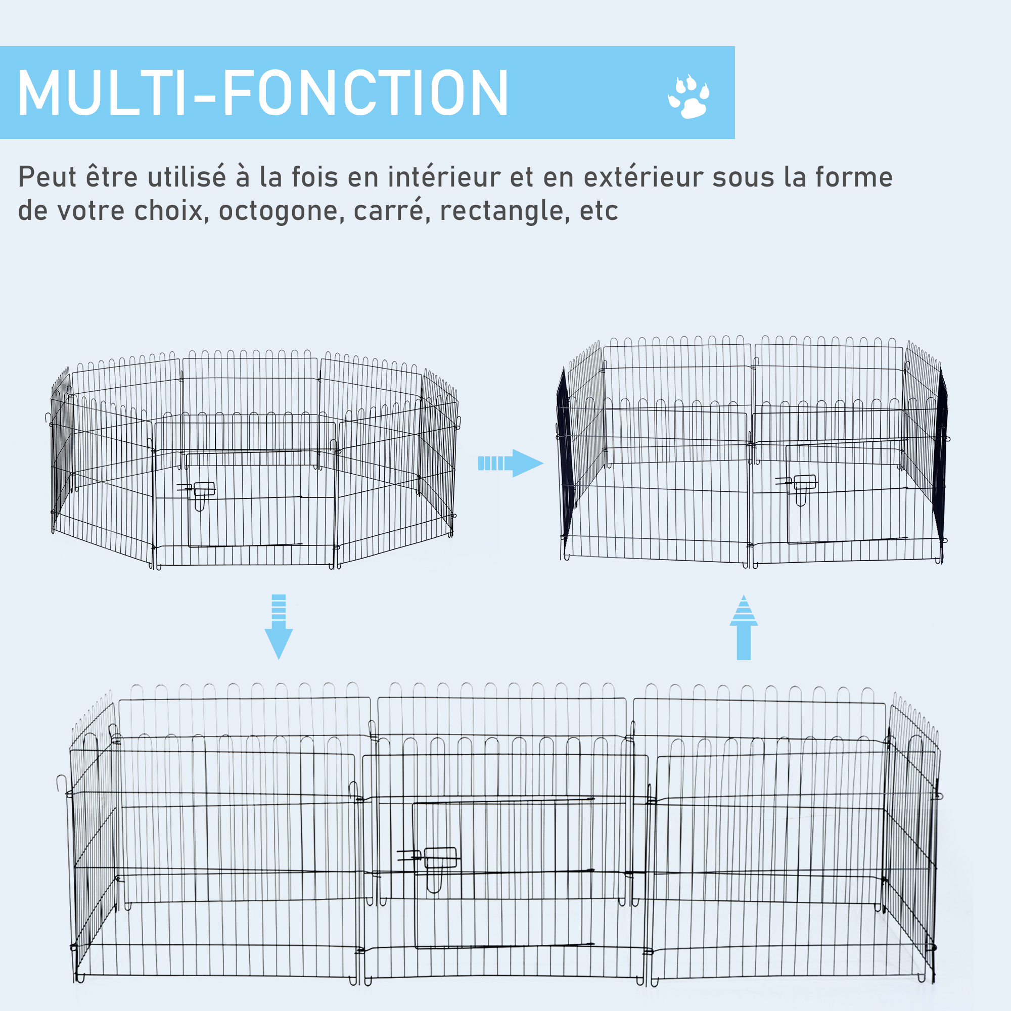 Ce parc enclos convient à tous types d'animaux de compagnie tels les chiens, les chats, les lapins, etc... Doté de 8 panneaux, vous pourrez modifier sa configuration à votre guise suivant les préférences de vos animaux. Équipé d'une porte avec système de verrouillage, vos animaux profiterons d'un espace adaptable et entièrement sécurisé !
