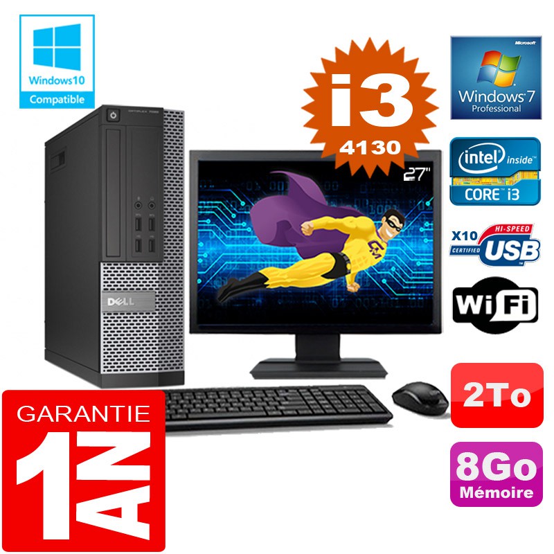 PC DELL 7020 SFF Core I3-4130 Ram 8Go Disque 2 To Wifi W7 Ecran 27"