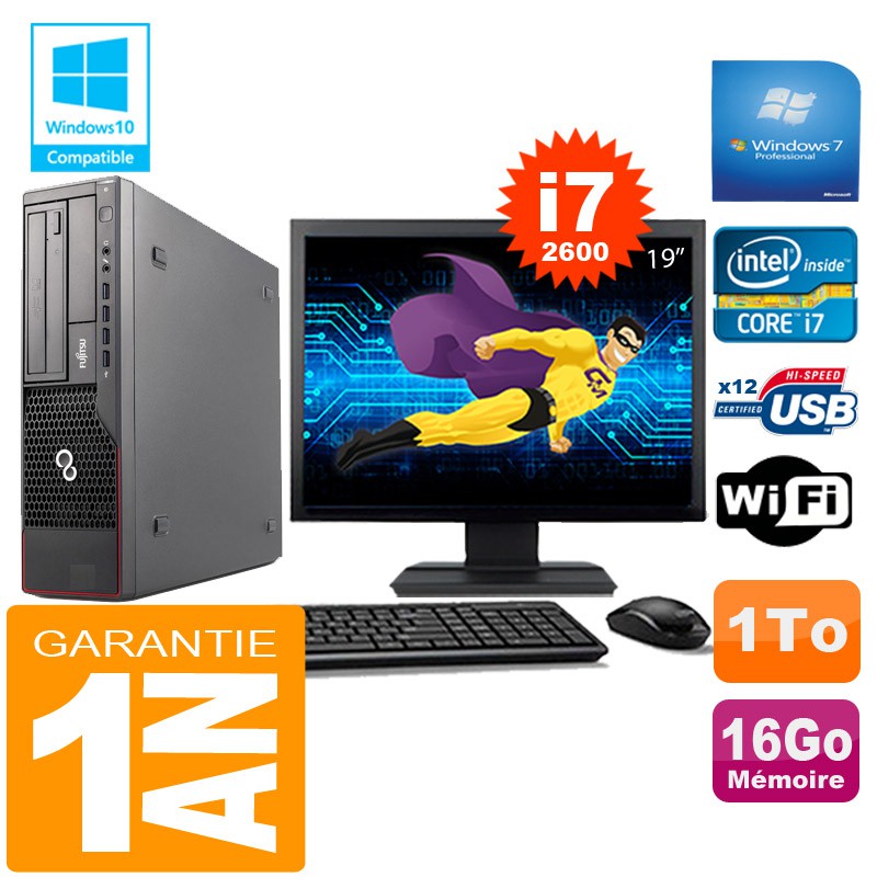 PC Fujitsu Esprimo E700 E90+ SFF Core I7-2600 16Go Disque 1 To Wifi W7 Ecran 19"