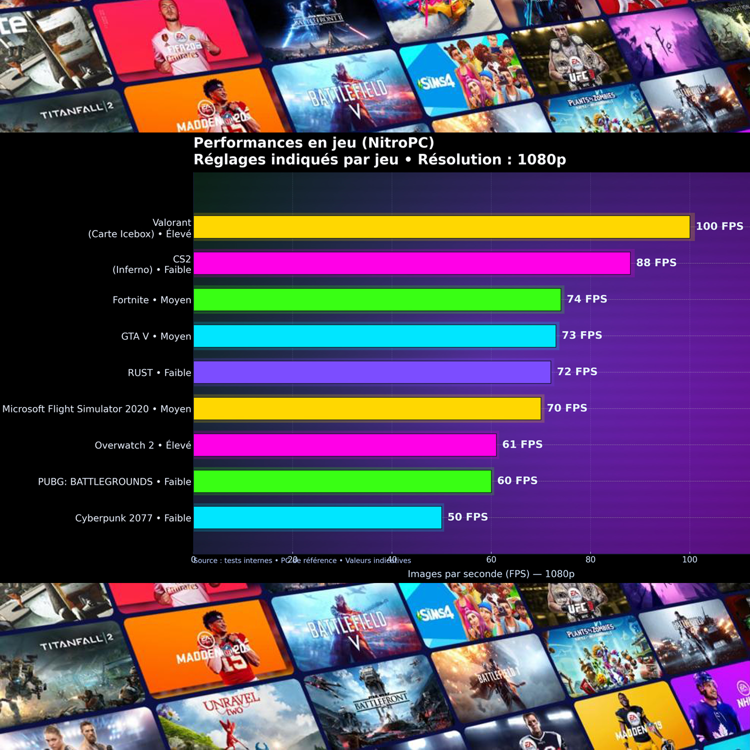 NitroPC, c’est bien plus qu’un PC: c’est la force du gaming haute couture à l’européenne. Conçu de A à Z dans nos ateliers, chaque boîtier exclusif embarque des composants premium pour des parties légendaires, un travail sans limites ou des études fluides. Choisir NitroPC, c’est parier sur la performance authentique et la sérénité dès le premier démarrage.