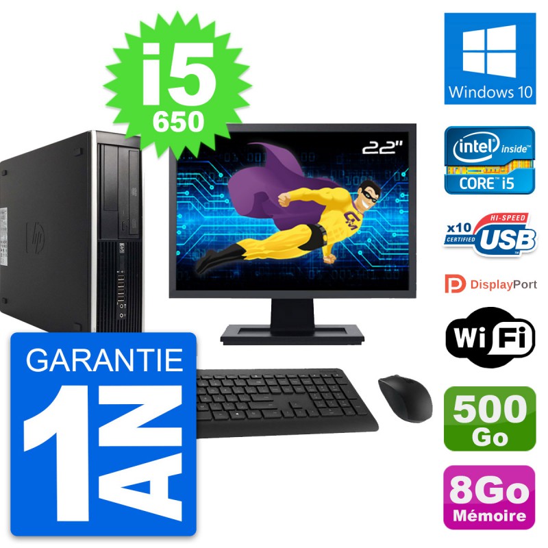 PC HP 8100 Elite SFF Ecran 22" Core i5-650 RAM 8Go Disque 500Go Windows 10 Wifi