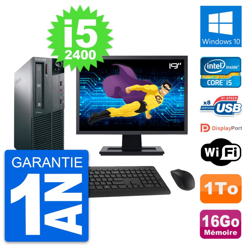 PC Lenovo M81 SFF Ecran 19" Intel i5-2400 RAM 16Go Disque 1To Windows 10 Wifi
