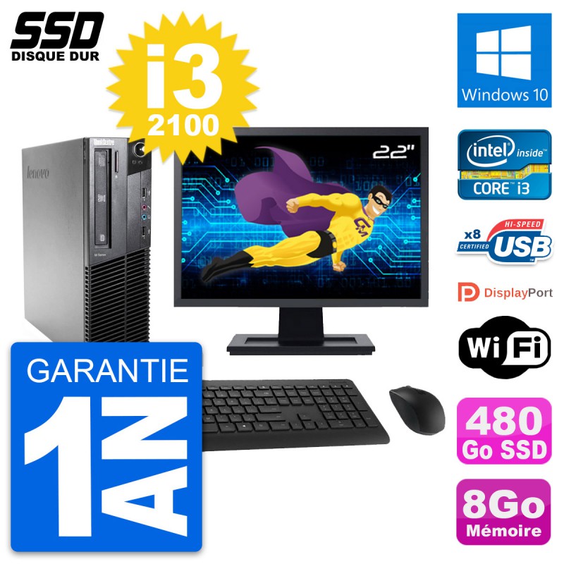 PC Lenovo M81 SFF Ecran 22" Intel Core i3-2100 RAM 8Go SSD 480Go Windows 10 Wifi
