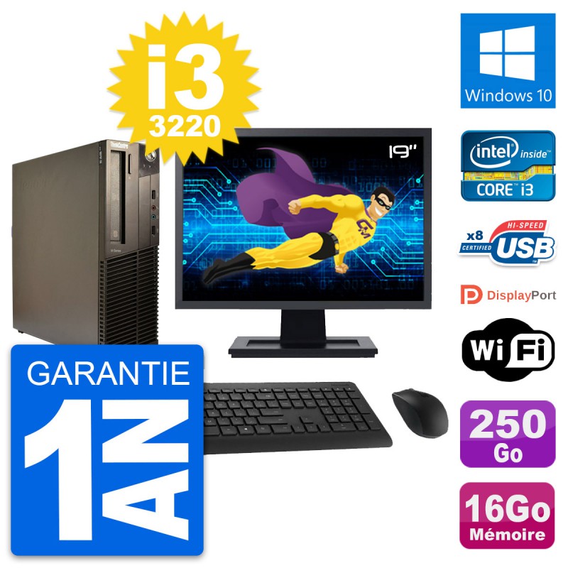PC Lenovo M82 SFF Ecran 19" Intel i3-3220 RAM 16Go Disque 250Go Windows 10 Wifi