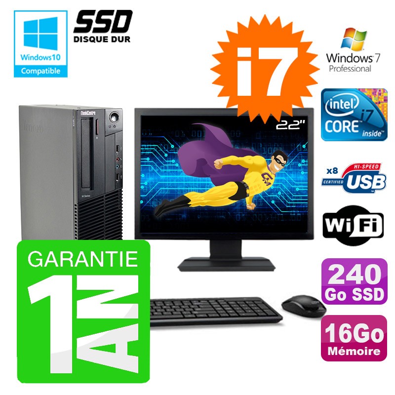 PC Lenovo M91p SFF Intel I7-2600 16Go Disque 240Go SSD Graveur Wifi W7 Ecran 22"