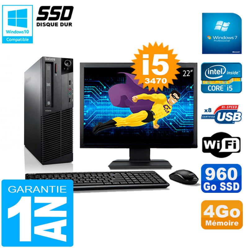 PC Lenovo M92p SFF Ecran 22" Core I5-3470 4Go Disque 960Go SSD Wifi W7