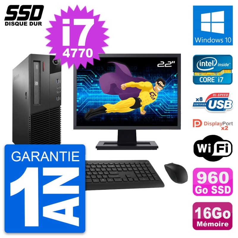 PC Lenovo M93p SFF Ecran 22" Intel i7-4770 RAM 16Go SSD 960Go Windows 10 Wifi