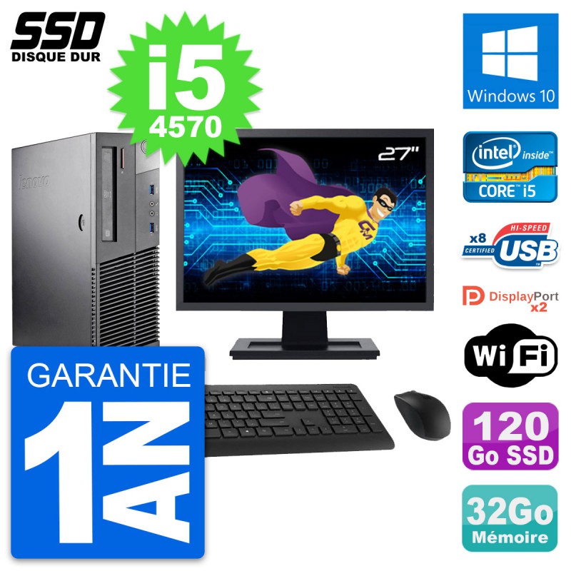 PC Lenovo M93p SFF Ecran 27" Intel i5-4570 RAM 32Go SSD 120Go Windows 10 Wifi