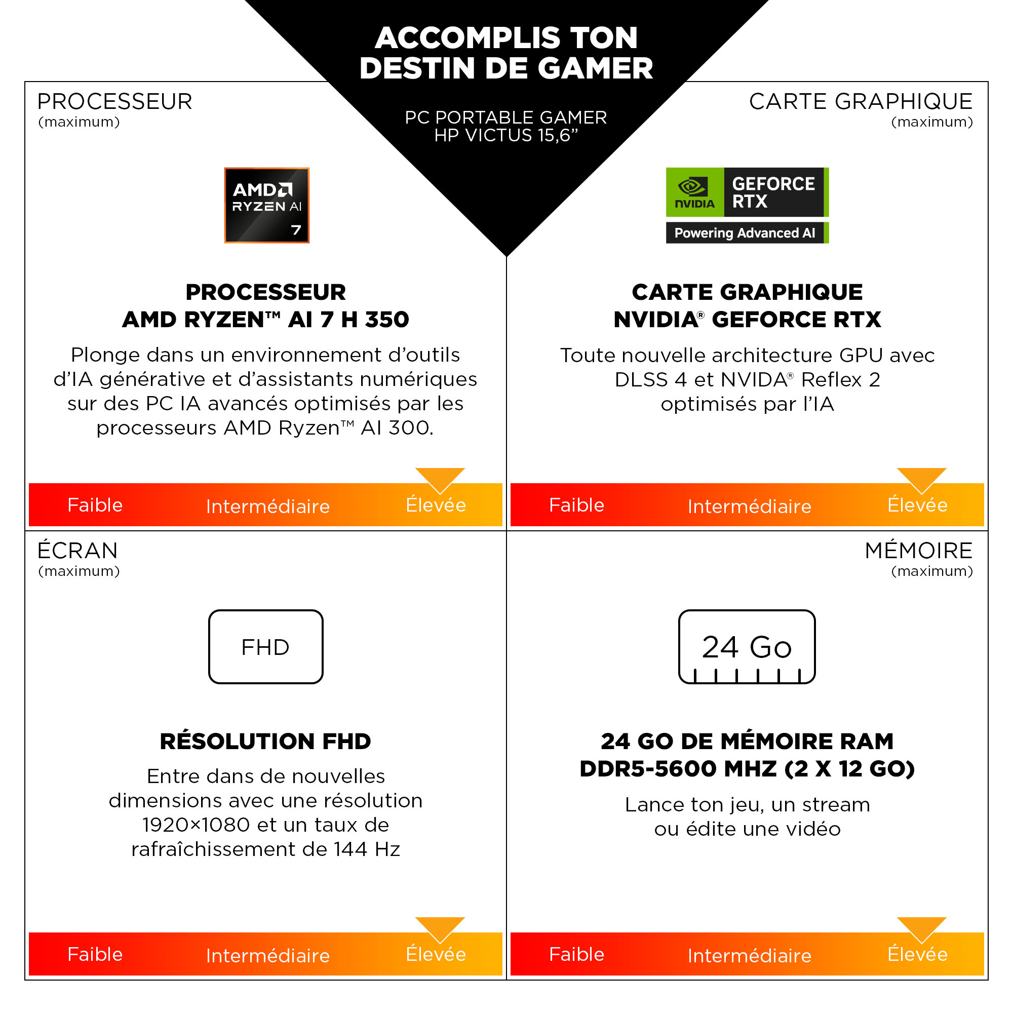 | Libellé | PC Portable HP 15-fb3031nf | 15.6" Full HD | AMD Ryzen AI 5 340 | 24 Go RAM | 512 Go SSD | RTX 5060 |