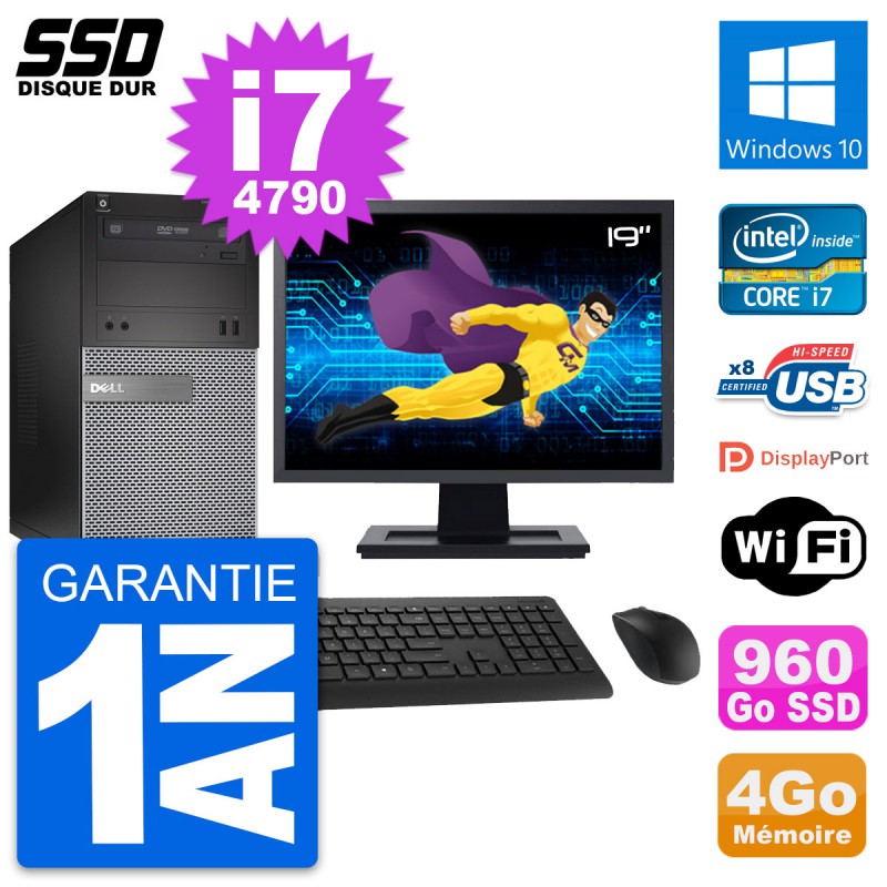 Libellé PC Tour Dell 3020 Ecran 19" Intel Core i7-4790 RAM 4Go SSD 960Go Windows 10 Wifi
